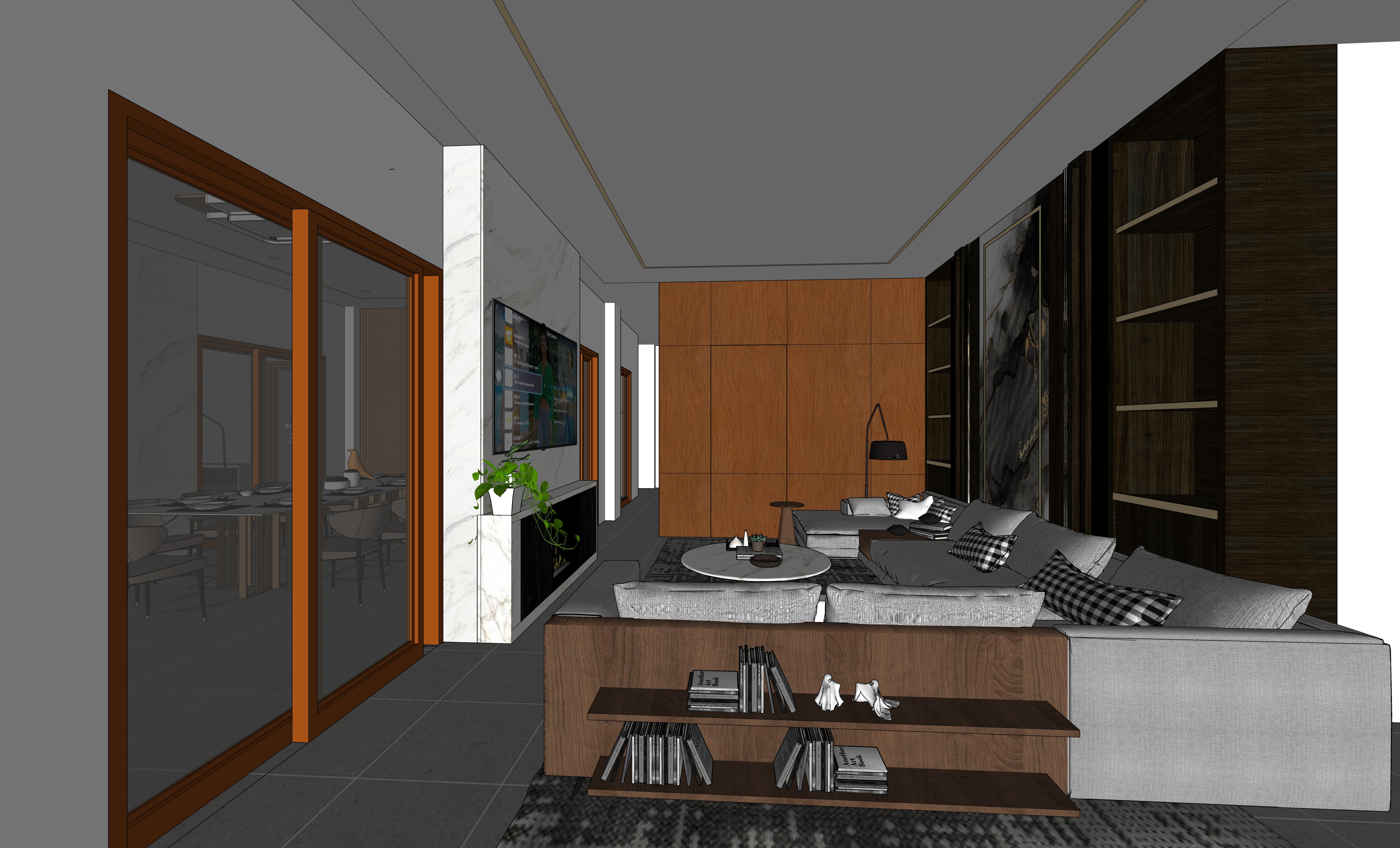 create a sophisticated modern living room with a warm and inviting atmosphere use soft grey tones for the sectional sofa and dark wood for the paneling and bookshelves incorporate a light marble feature around the tv for elegance add rich textures with charcoal grey flooring and a geometric black and white rug include burnt orange frames for the glass doors to add a pop of color enhance the scene with lush green indoor plants and soft ambient lighting to create a cozy welcoming environment