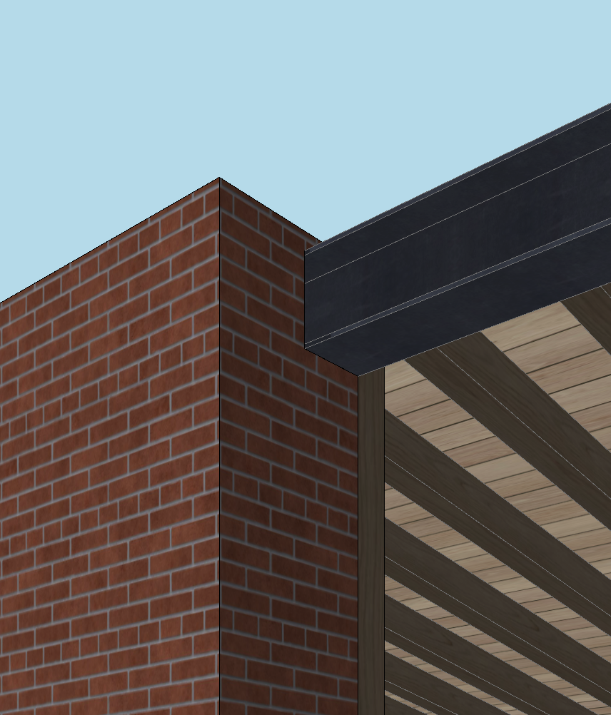 detail shot of a an i beam resting in a thick brick wall supporting a timber framed roof brick to be recycled brick