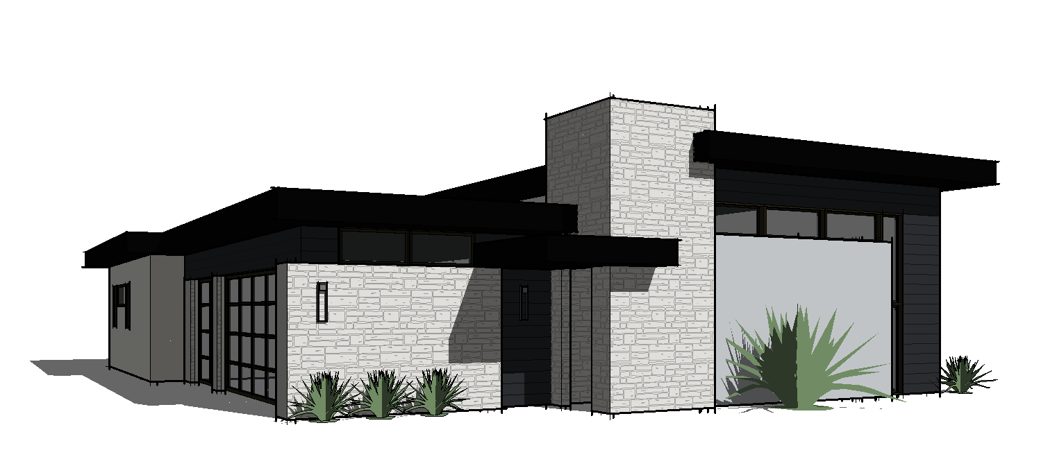 modernist exterior shot use the provided architectural model exactly as reference dark charred horizontal wood siding white stucco and white textured stone wall without repeating stones dark painted roof fascia to match the wood driveway on the left warm porch light glowing do not modify the architecture proportions or geometry material placement must match the design exactly cutout for front door in the stone tower lighting bright palm springs midday sun with neutral daylight color balance environment palm springs residential neighborhood with desert landscaping agave plants gravel ground cover concrete driveway curb and asphalt street sky deep blue desert sky with thin wispy cirrus clouds camera professional architectural real estate photograph full frame dslr 35mm lens f 8 iso 100 rendering style ultra photorealistic architectural photography with realistic materials and subtle imperfections architecture