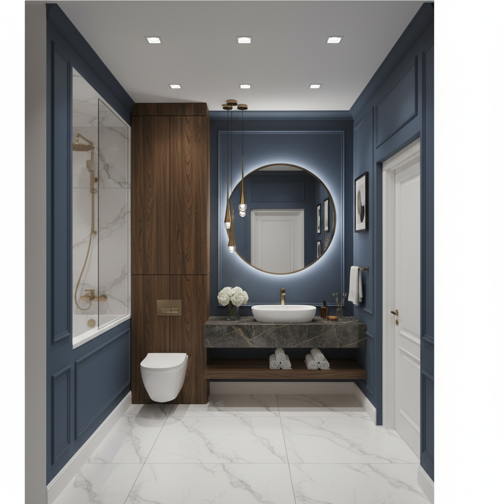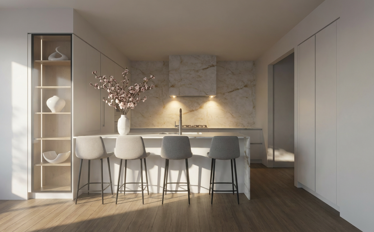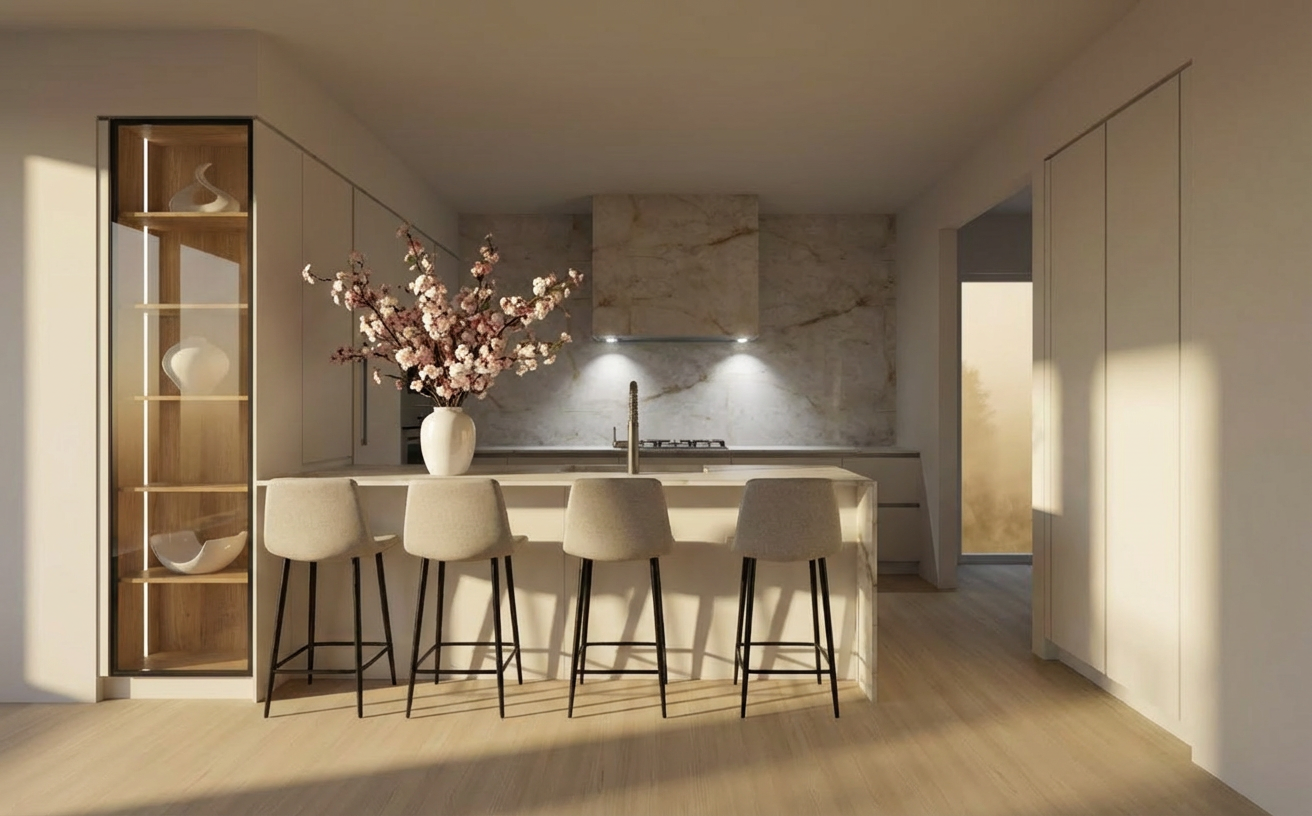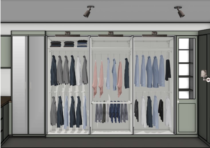 please render this as if it were in an architecture magazine do not change any dimensions colors or details please add soft warm lighting coming from light fixtures this is a closet that receives no natural lighting