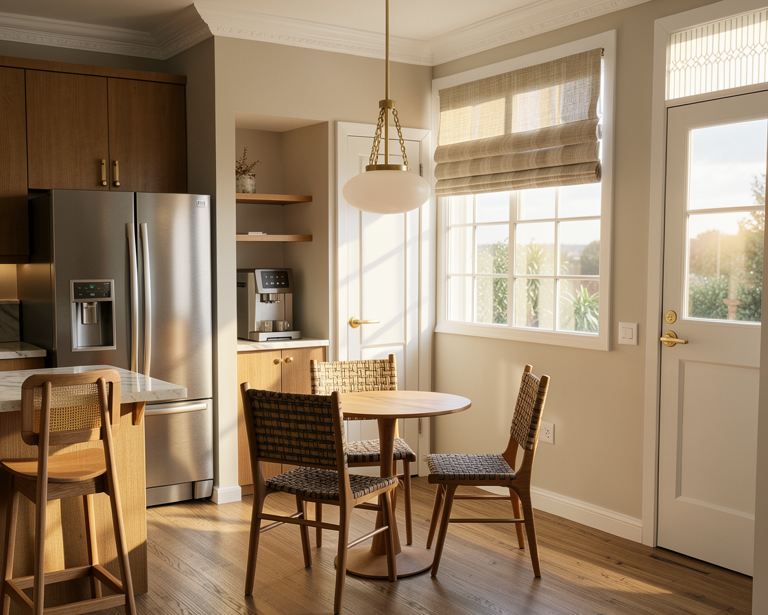 turn this model into a photo realistic image with olive green cabinets and walnut accents