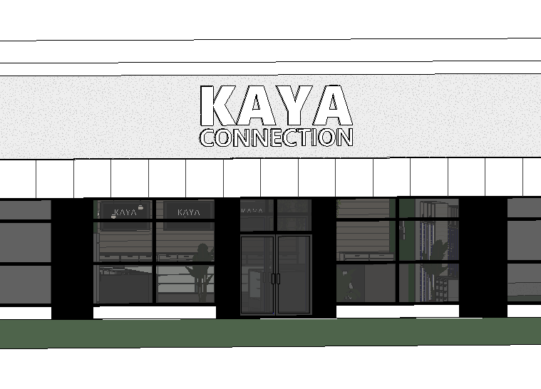 make look realistic and inviting add distant trees behind the building natural lighting parking in front make look inviting inside but keep the layout that is in the photo there are identical shops on either side of this building the sign says kaya connection