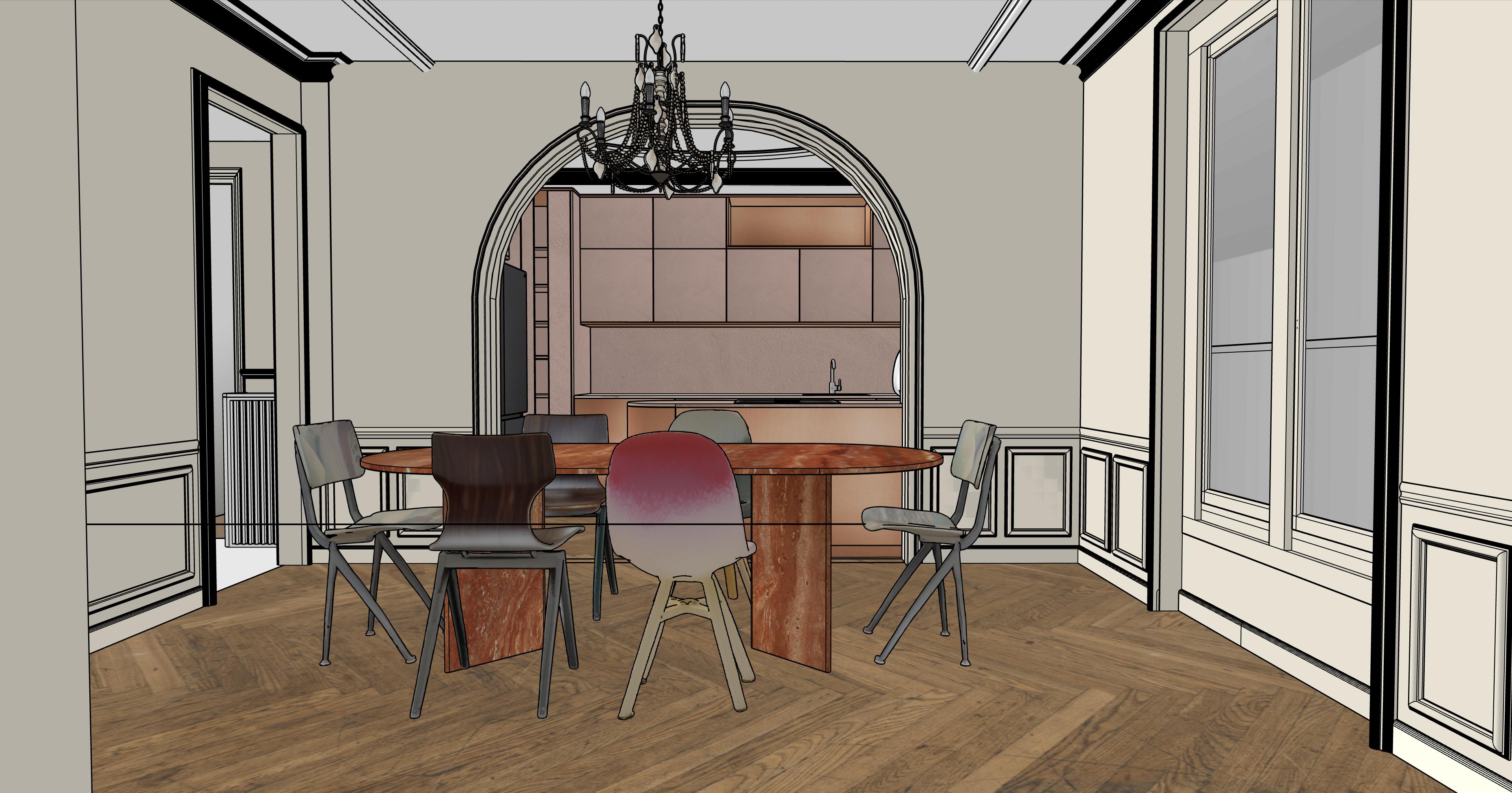 exterior shot a refined parisian haussmann dining room with classic wall moldings and high ceilings featuring a herringbone point de hongrie oak parquet floor in warm natural tones at the center a sculptural oval dining table made of red travertine stone with a monolithic base around it a mix of contemporary dining chairs in muted tones in the background an open kitchen framed by a large rounded archway with cabinetry in vivid copper finish and soft pink polished concrete b ton cir rose creating a warm and sophisticated contrast walls painted in farrow ball skimming stone offering a soft neutral backdrop a vintage crystal chandelier hangs centrally adding elegance and historical character soft natural daylight coming from tall french windows subtle shadows warm ambiance high end interior design realistic materials detailed textures photorealistic rendering optional tweaks you can add depending on the tool ultra realistic 4k global illumination soft shadows cinematic lighting lens 35mm eye level perspective slightly desaturated tones warm highlights