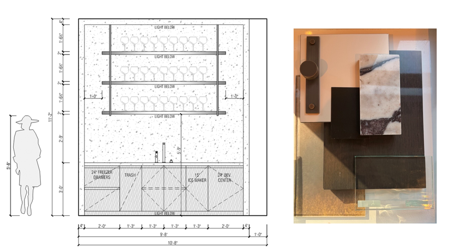 apply the material pallet to the provided 2d elevation of a wet bar the stone is a honed arabescato viola on the countertop backsplash and frame the millwork is riftcut white oak the metal finishes are an antique brass refer to the provided scheme for clarity in material tone