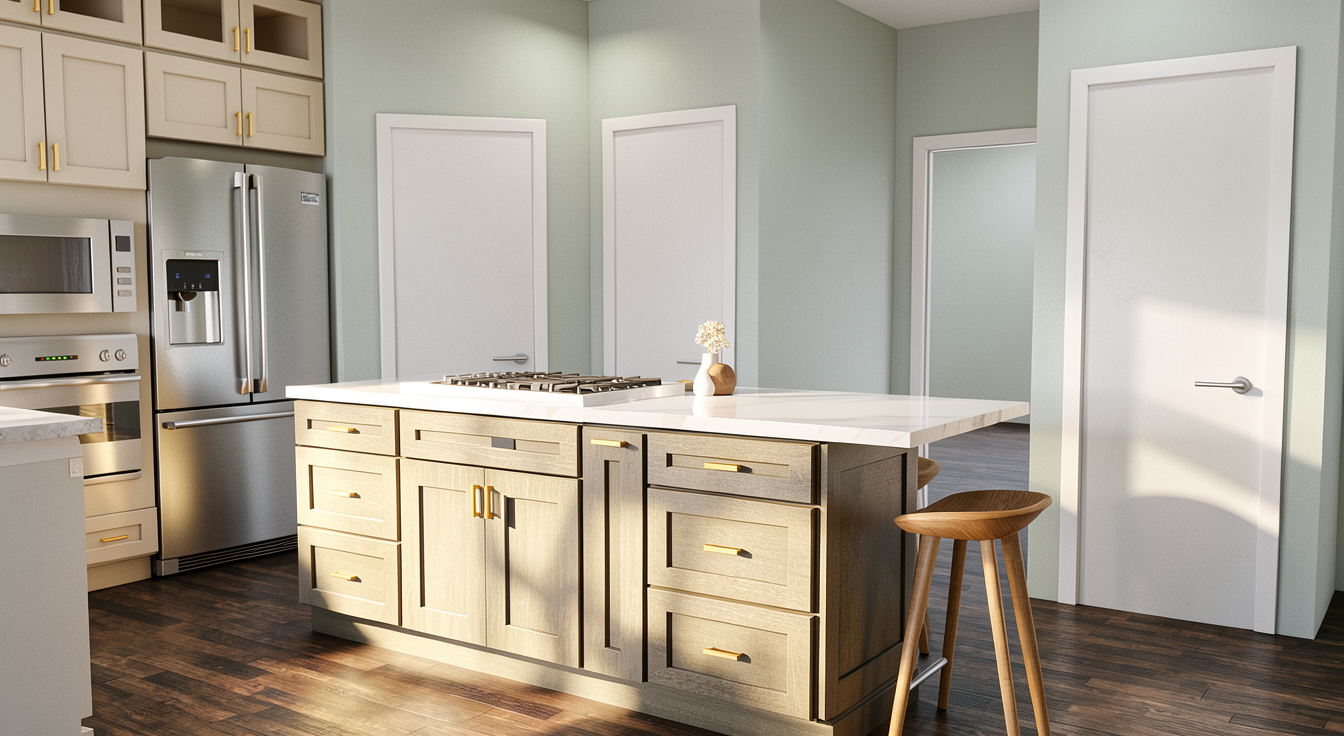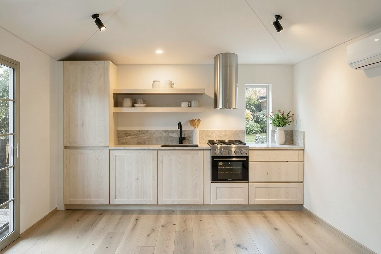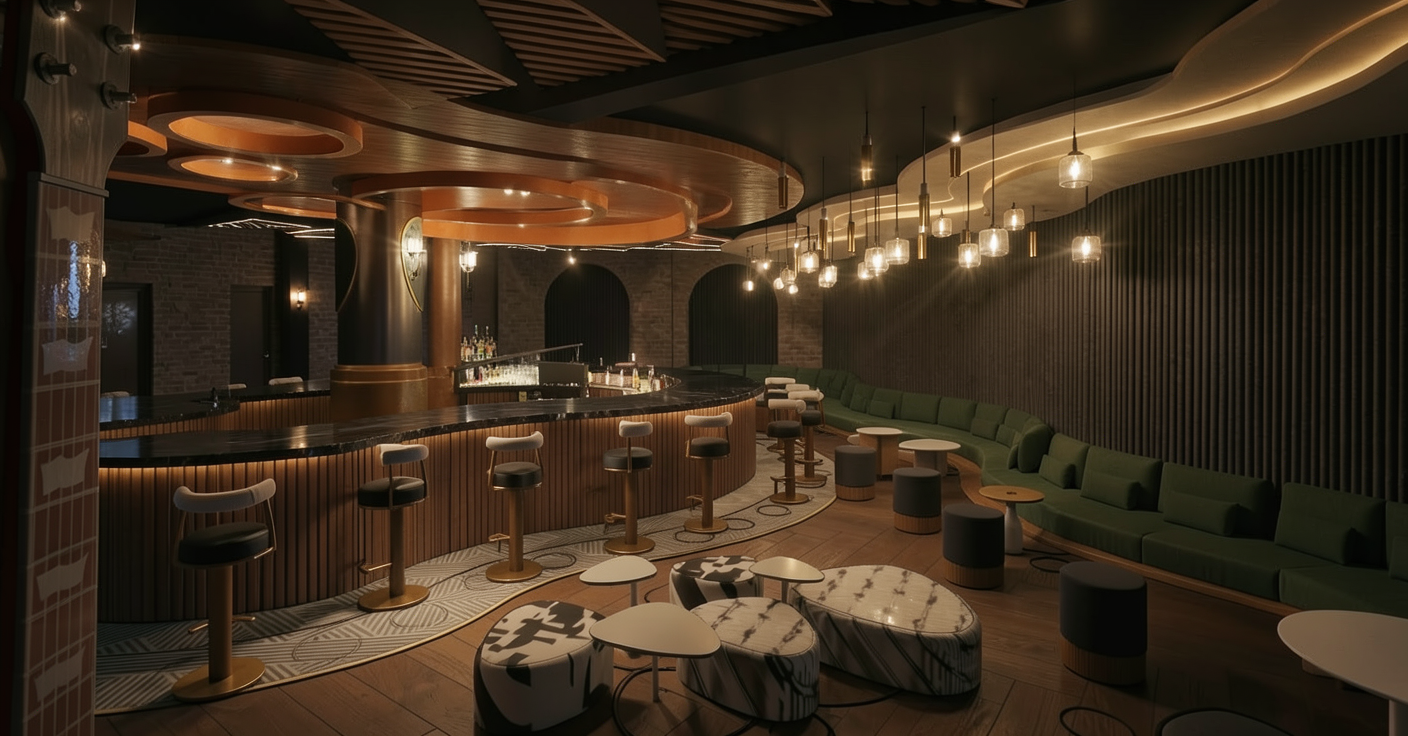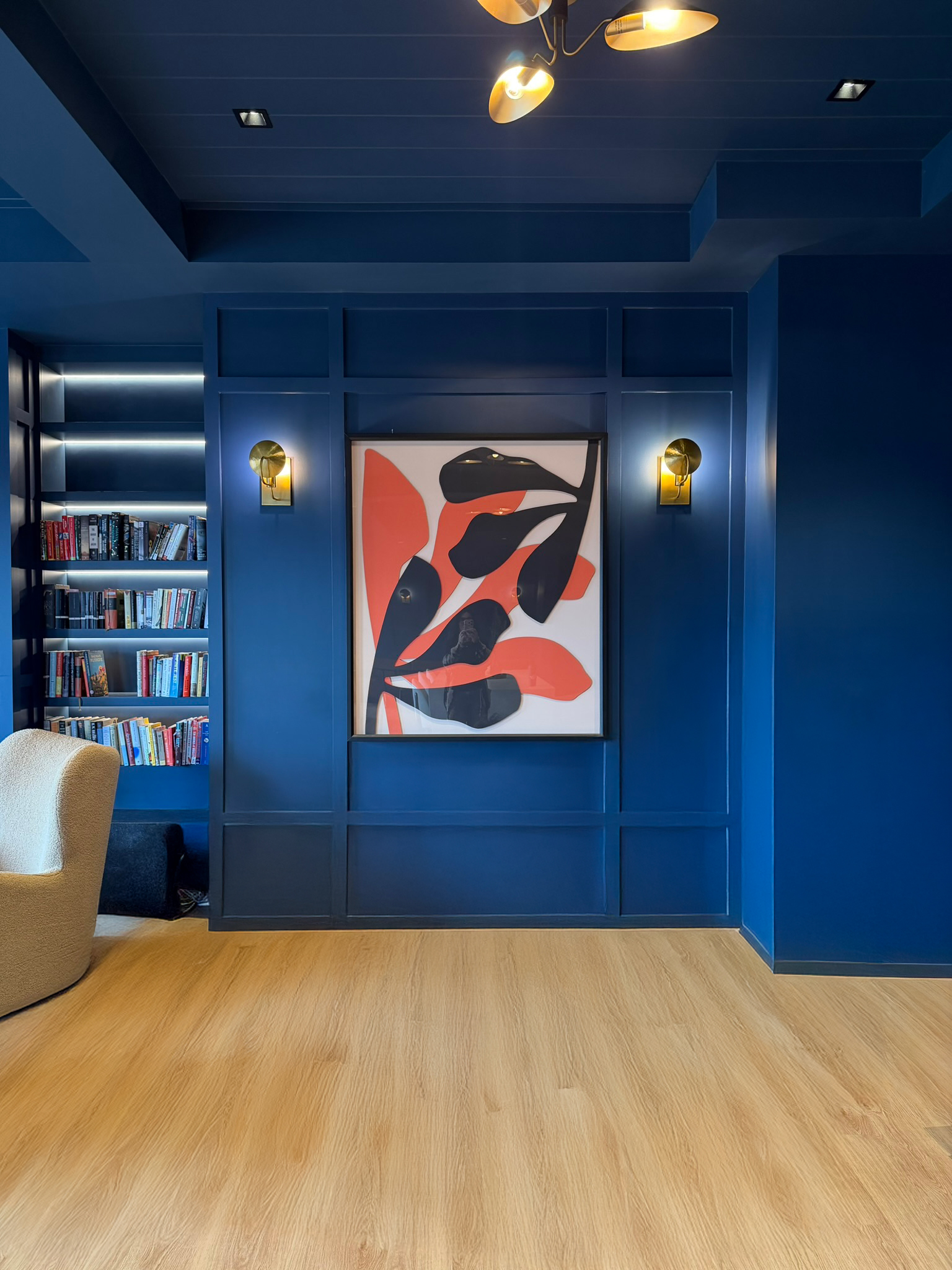 place foosball table centered on back wall underneath artwork add decorative objects and books at bookshelf only lighting at shelves to be soft warm lights do not change anything else