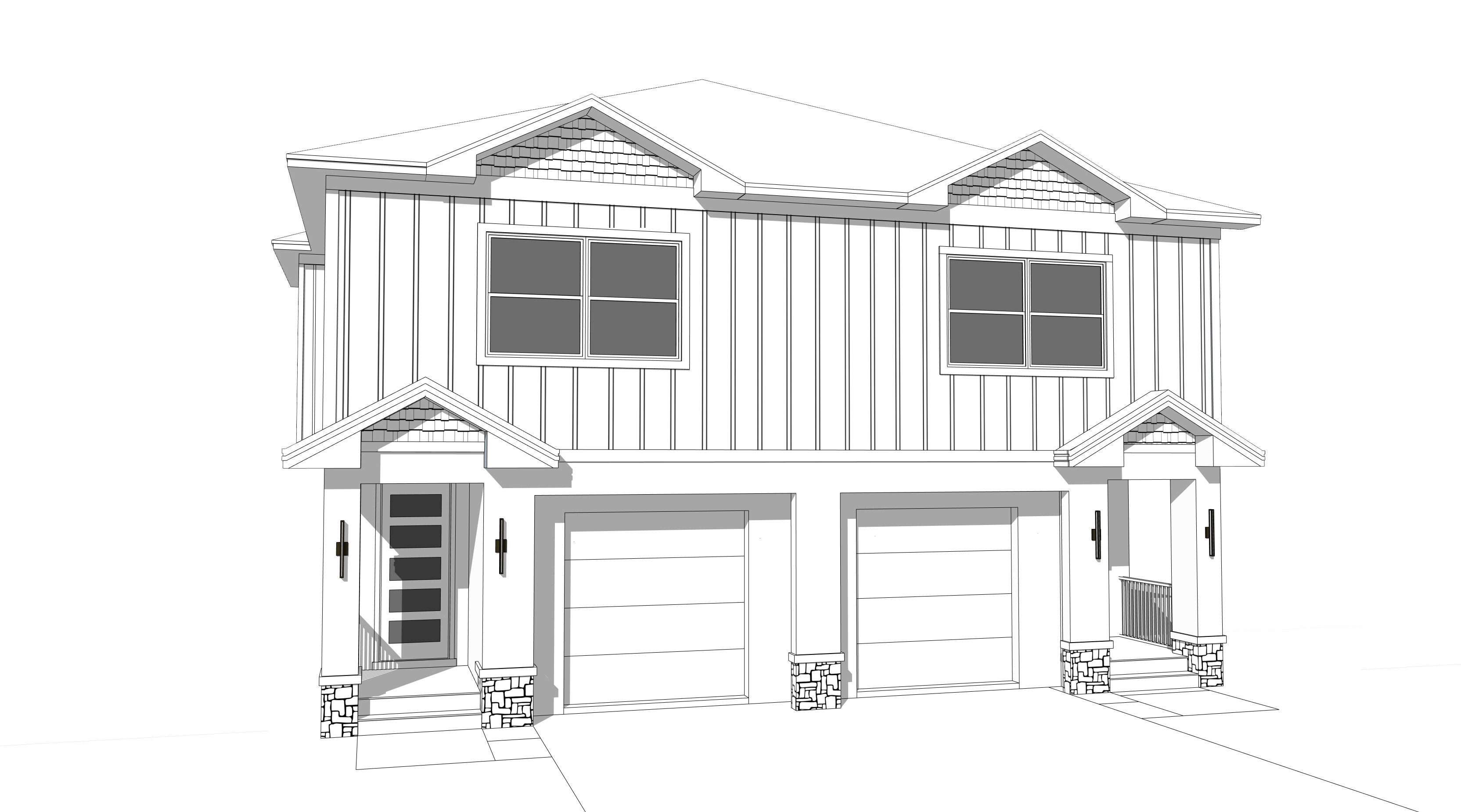 photo real rendering house paint sherwin williams snowbound black shingle roof front door is sherwin williams color naval blue gray stone at the bottom of the columns gray paver driveway and walkway lush florida trees no foreground trees low shrubs around house grass on sides yards a bright sunny day