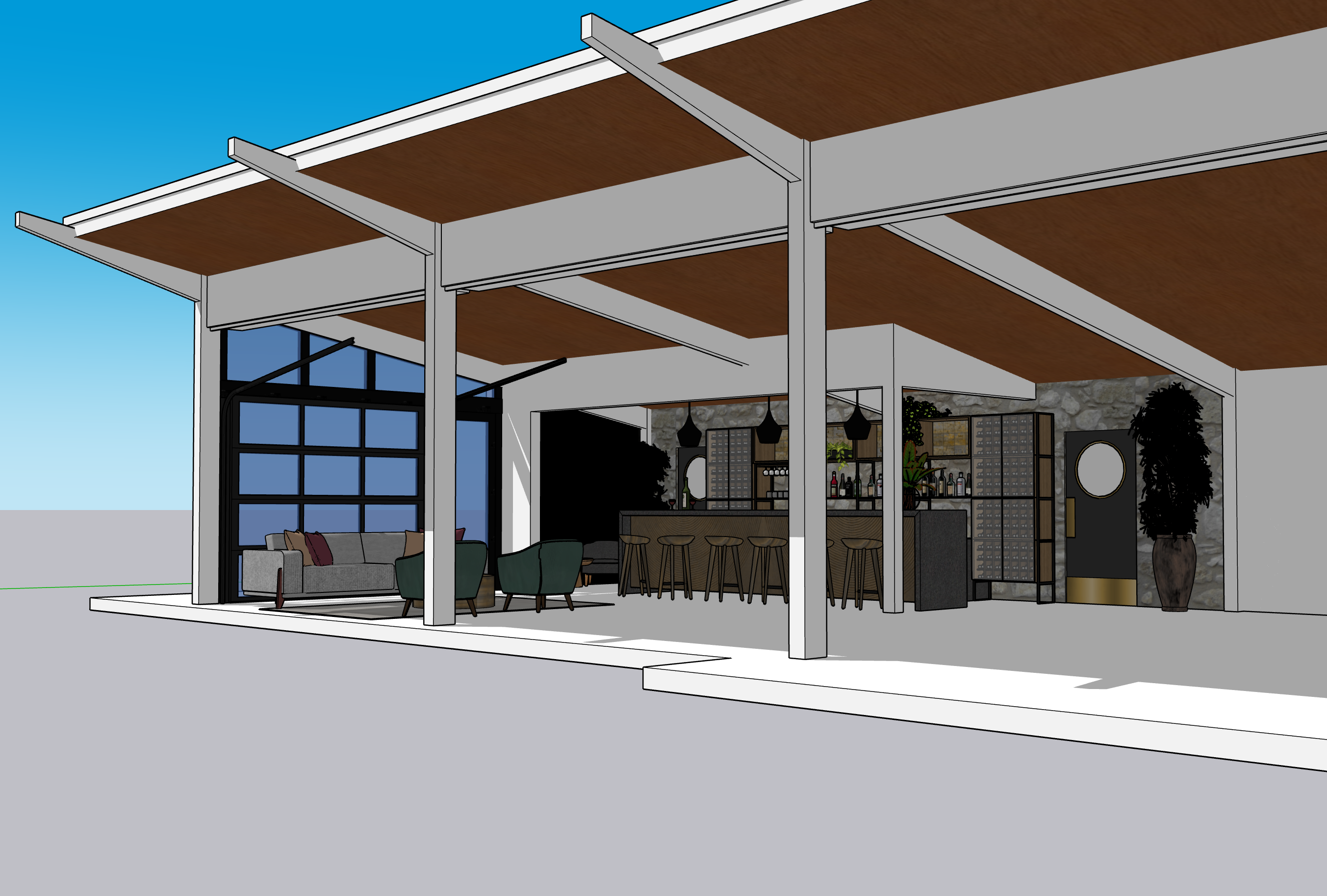 please make it a lounge area in the two left bays for a high end bar lounge attached to an outdoor golf simulator the two eastern bays are active simulator bays