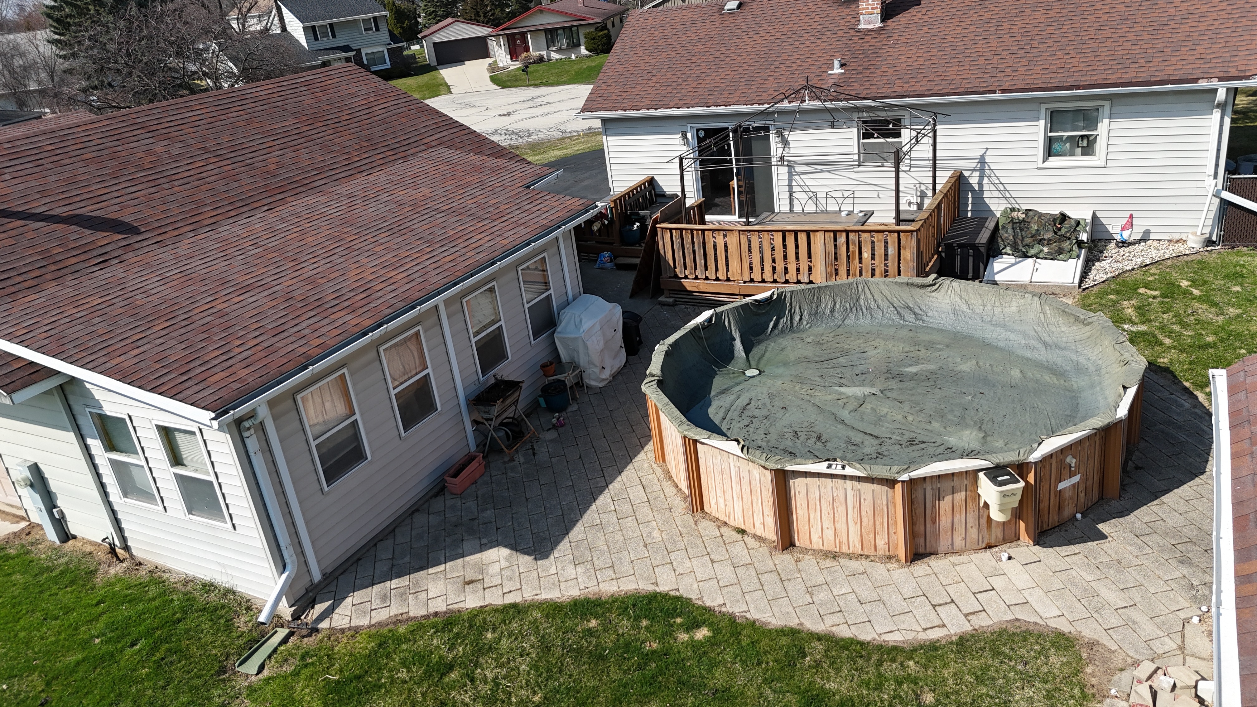 photorealistic renovation of the existing backyard keep the house pool patio and layout exactly the same size and position do not redesign or move structures build a wraparound composite deck fully surrounding the existing above ground pool the entire deck must remain on the same level as the current house door and existing deck no multi level deck add one set of stairs located on the left side of the pool near the house circled patio area leading up from the patio into the deck sunroom level add a sunroom attached to the back of the house at the same height as the deck and existing door the sunroom features large black framed folding glass exterior doors bifold doors fully open across the entire wall similar to modern patio folding doors inside the sunroom include an indoor outdoor bar counter with stools facing outward toward the deck similar to a pass through bar setup keep all proportions realistic match existing house siding and style and maintain original property layout clean modern residential design realistic materials photorealistic rendering do not change pool size do not move structures only one stair location at left side near house no additional stairs