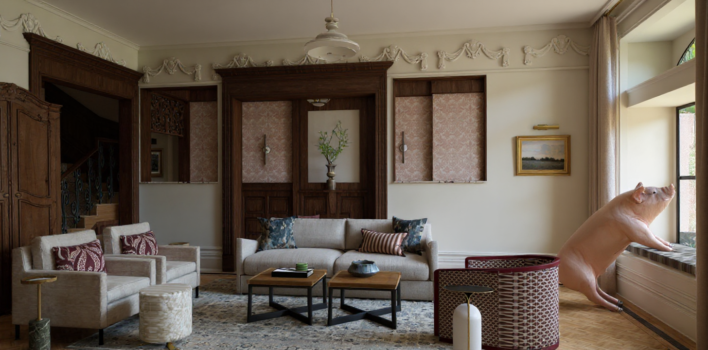 render a atrium lobby with access to the modern cafe with all sconces to be turned on all second level windows are opaque add business people walking in lobby and enjoying coffee on the sofas and stools setting in the middle of the day