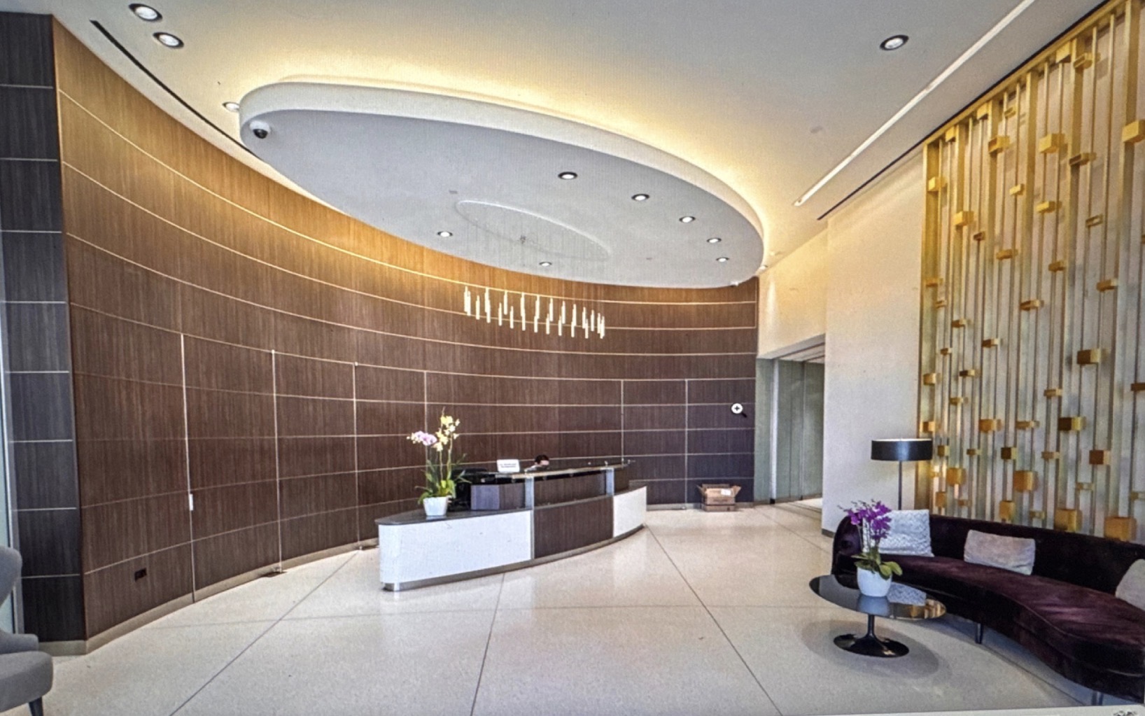 reclaimed wood cedar ceiling with can down lighting all around and illuminated oval like in existing the far right wall should be stacked limestone finish with ivy and wandering jew growing down from the top