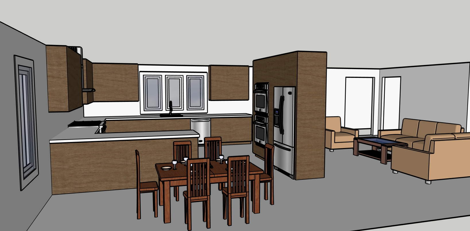 make it real and include people in the kitchen dining room and living room with light colored wood flooring remove the plants in the background
