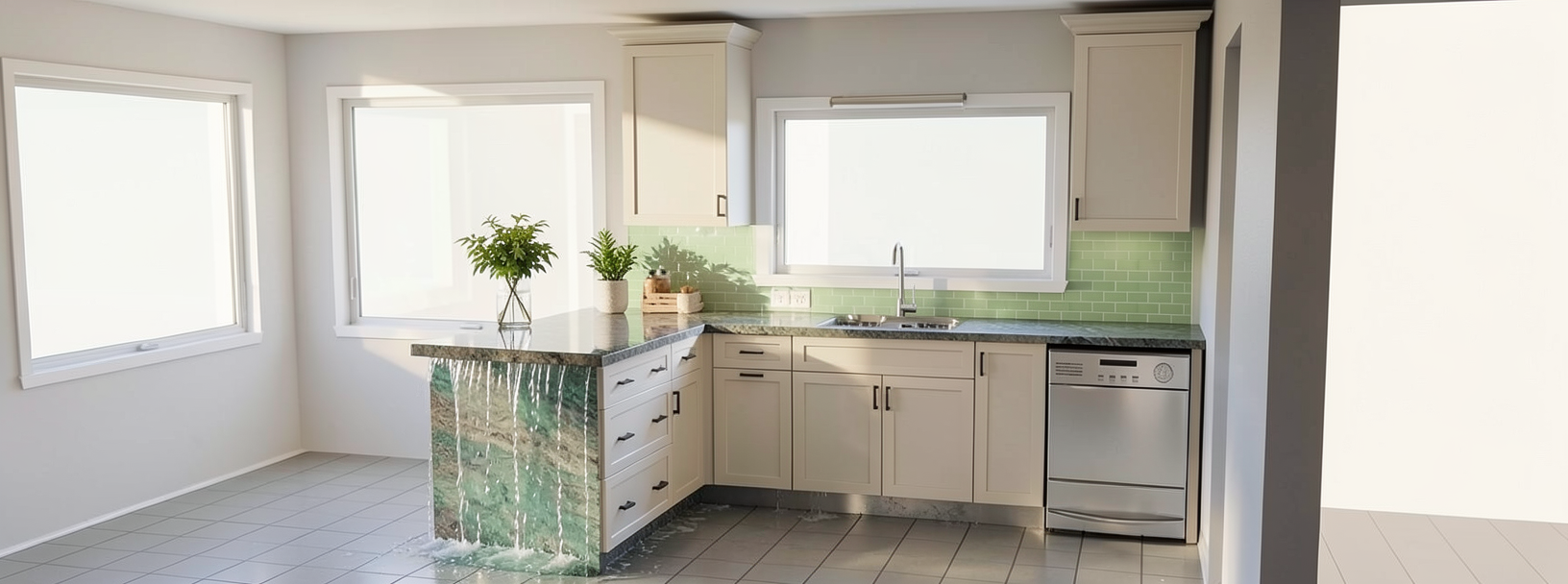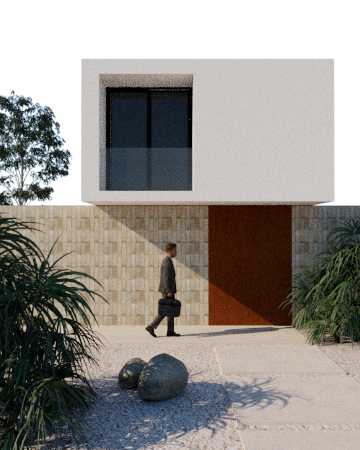 photorealistic exterior render strictly based on the original image composition geometry proportions and camera framing unchanged contemporary cubic house with white monocapa render matte slightly textured and beige stone base entrance with a flush frameless designer wooden door smooth and minimalist with discreet integrated handles restore and preserve the entrance paving pieces large format beige porcelain slabs clearly defined layout and joints with subtle tonal variation and realistic edges no continuous surface garden areas with natural white gravel remove the two stones from the foreground existing vegetation preserved and slightly enhanced in density keeping natural tones no oversaturation upper window and glass railing with subtle realistic reflections of sky and vegetation lighting maintain original sun direction mediterranean daylight soft contrast controlled highlights no overexposure ensure high realism accurate pbr materials correct roughness no plastic look balanced color grading clean mediterranean background with clear sky