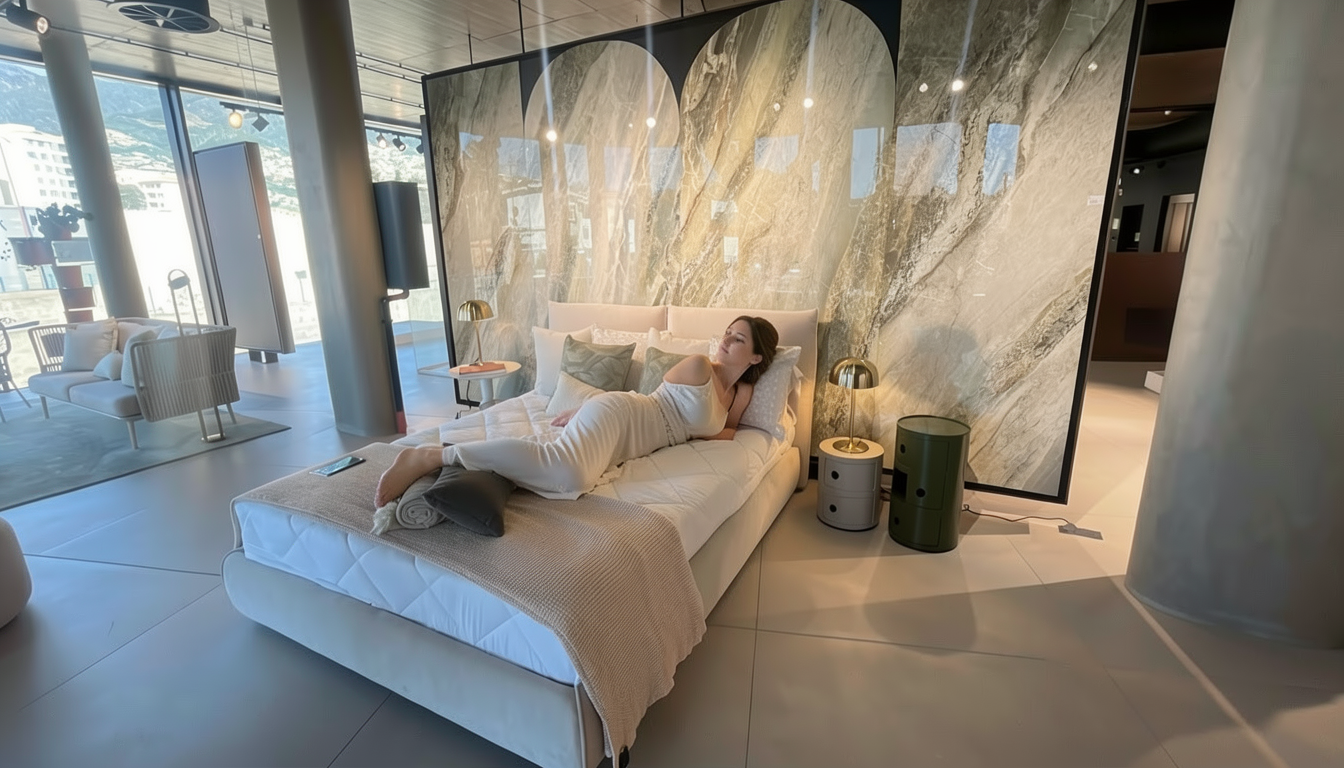 realistic image water in bath tub sunset sky outside windows interior lights on tiled shower walls with water running remove water from floor add towels wall art more colorful tile in the shower and tile on shower floor more ornate vanity and mirror add lights on each side of mirror