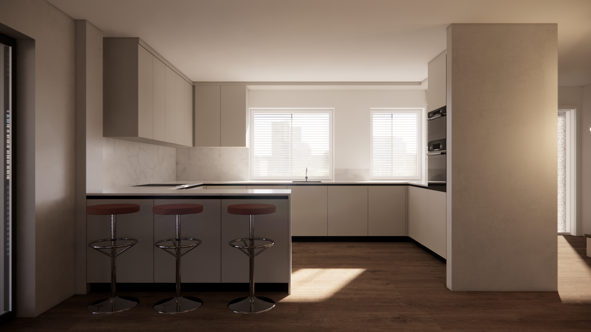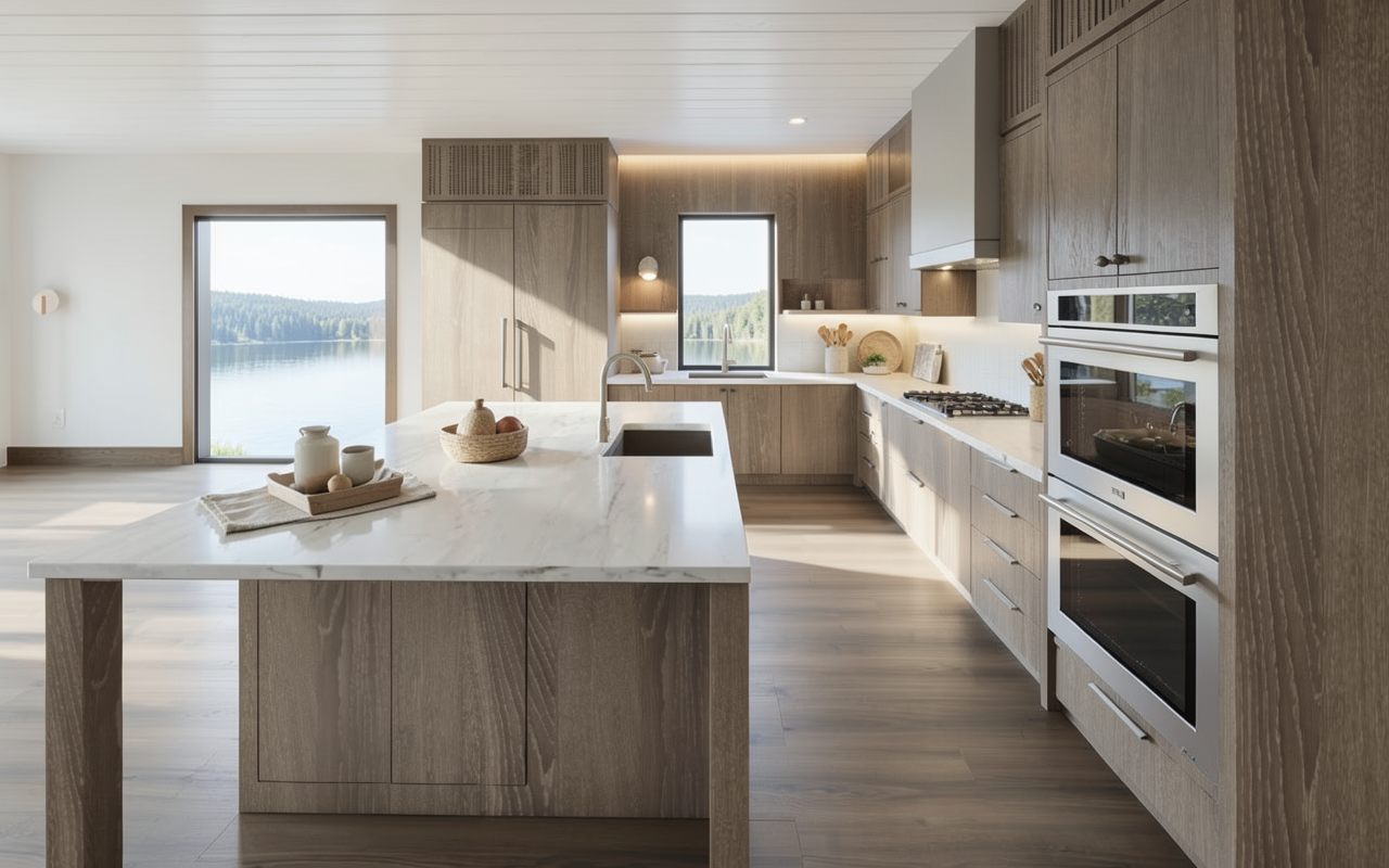 photorealistic postproduction for a modern minimalist kitchen soft neutral colors natural daylight light oak wood textures enhanced soft shadows balanced exposure calm and airy atmosphere