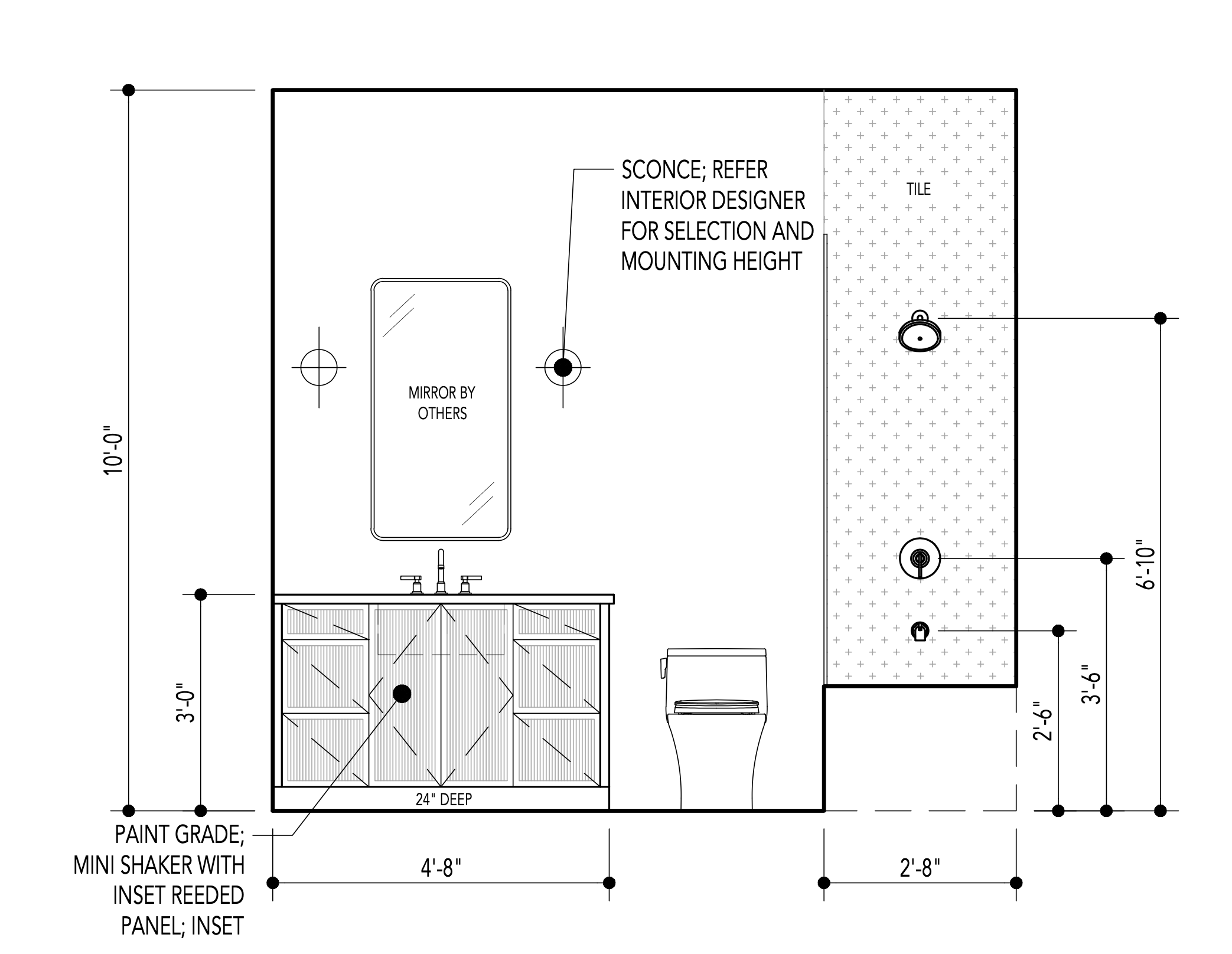 take this elevation and create a render i want the vanity to be painted sherwin williams urbane bronze sconces and faucet are shown in the reference page