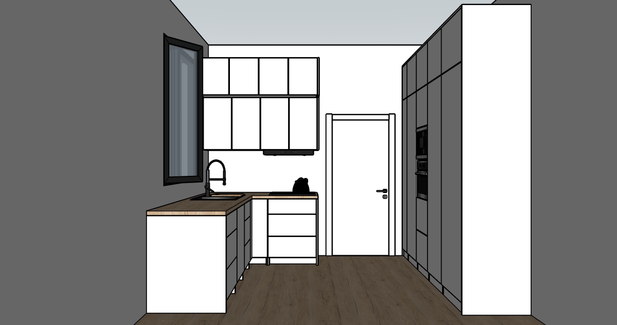 interior shot render a modern kitchen with a sleek minimalist design use a soothing palette with light grey cabinetry and white walls the countertop should be a natural oak color offering warmth against the cool tones incorporate black accents for handles and appliances the floor should have a rich walnut wood texture adding depth ensure the lighting is soft and ambient creating an inviting and cozy atmosphere architecture