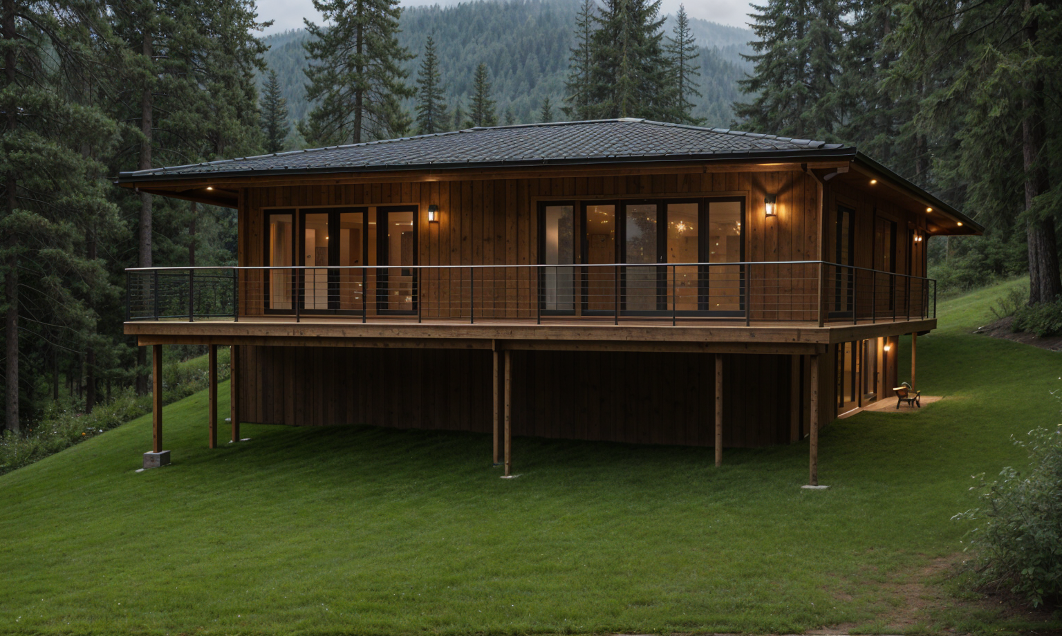 exterior shot set this house on a forested slope in the pacific northwest coastal rain forest with no grass around the home add some can lights in the soffit over the deck