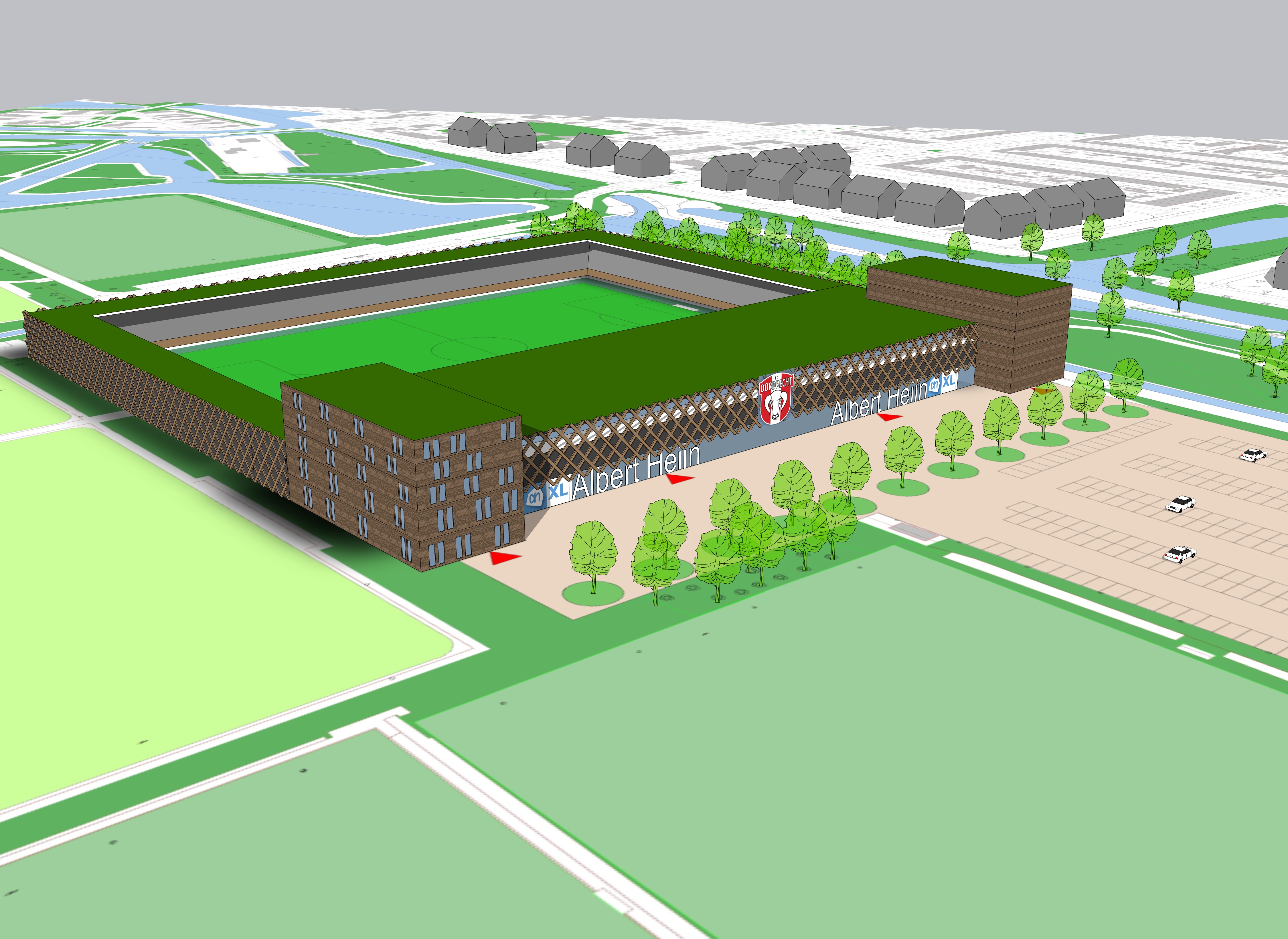 add trees in the scene around the soccer fields add a lot of people in the scene playing soccer on the soccer fields add a lot of cars in the parking lots