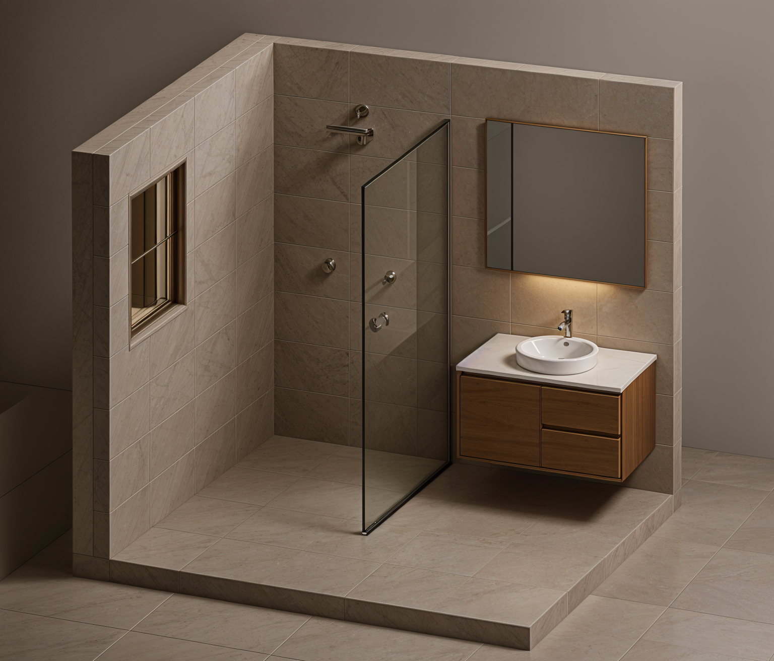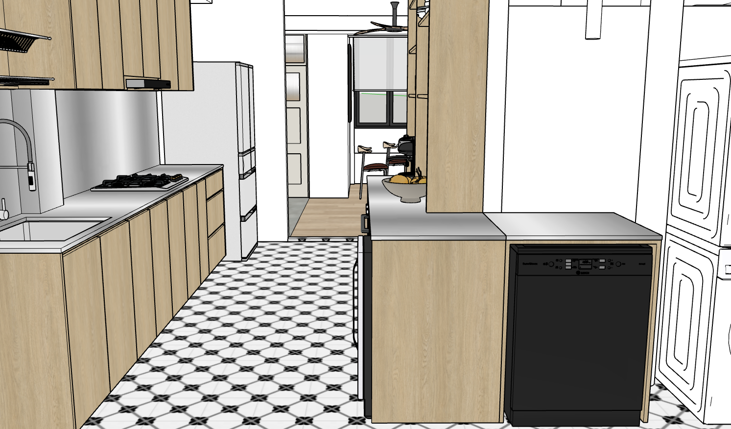 stainless steel counter top stainless steel backsplash led strip lighting matching wood colour panels black and white tile flooring white painted walls