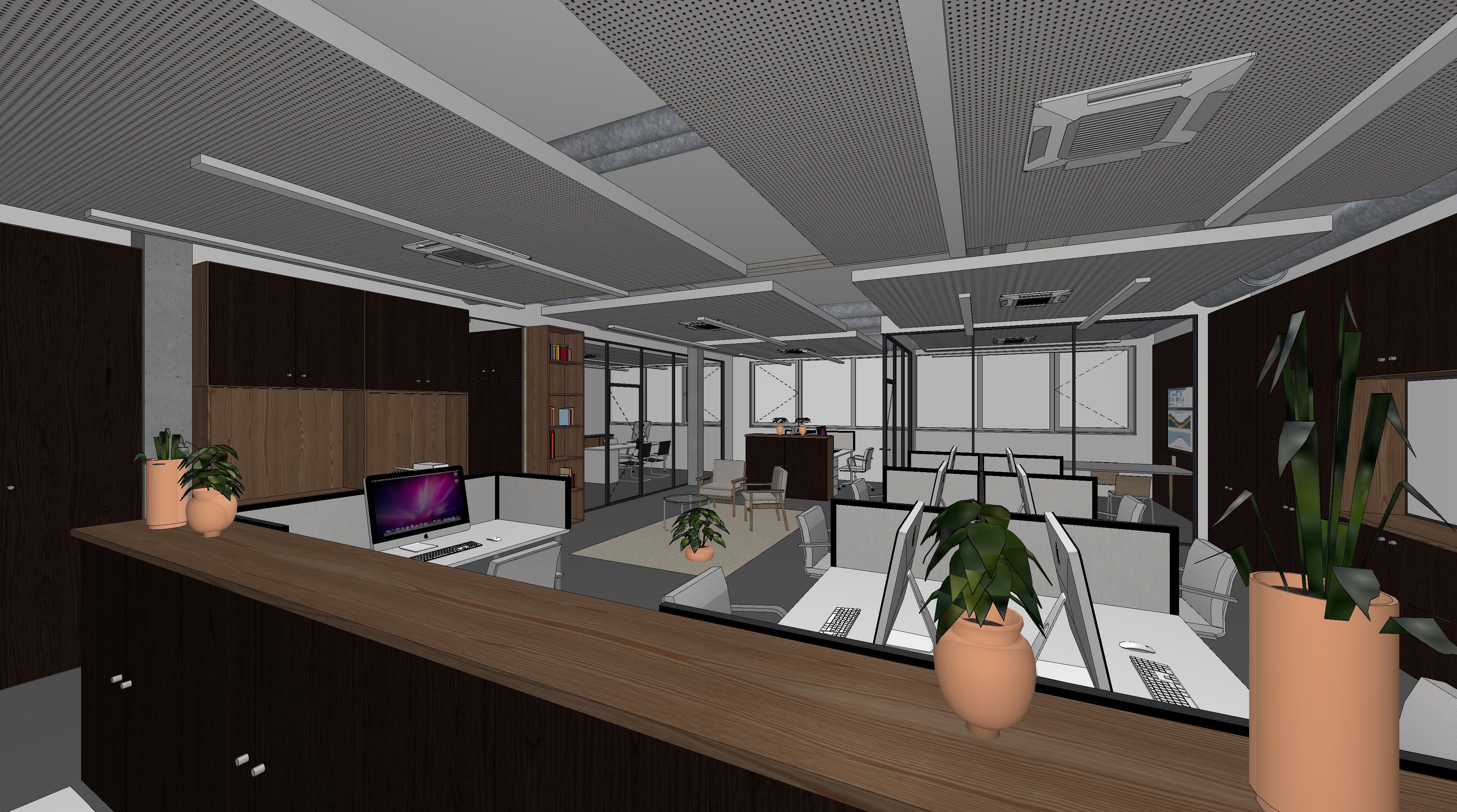 professional photorealistic office interior rendering modern open space workplace with dark walnut wood furniture and light wood accents perforated white plasterboard suspended ceiling suspended linear led lights with visible hanging cables exposed hvac ducts industrial style glass walled meeting rooms imac workstations cozy waiting area with beige armchairs potted plants in terracota pots dark gray matte epoxy resin flooring bright and clear atmosphere high key lighting abundant natural daylight from large windows architectural visualization high end corporate office design ultra detailed 8k resolution photorealistic materials realistic shadows and reflections professional interior photography style depth of field ambient occlusion global illumination