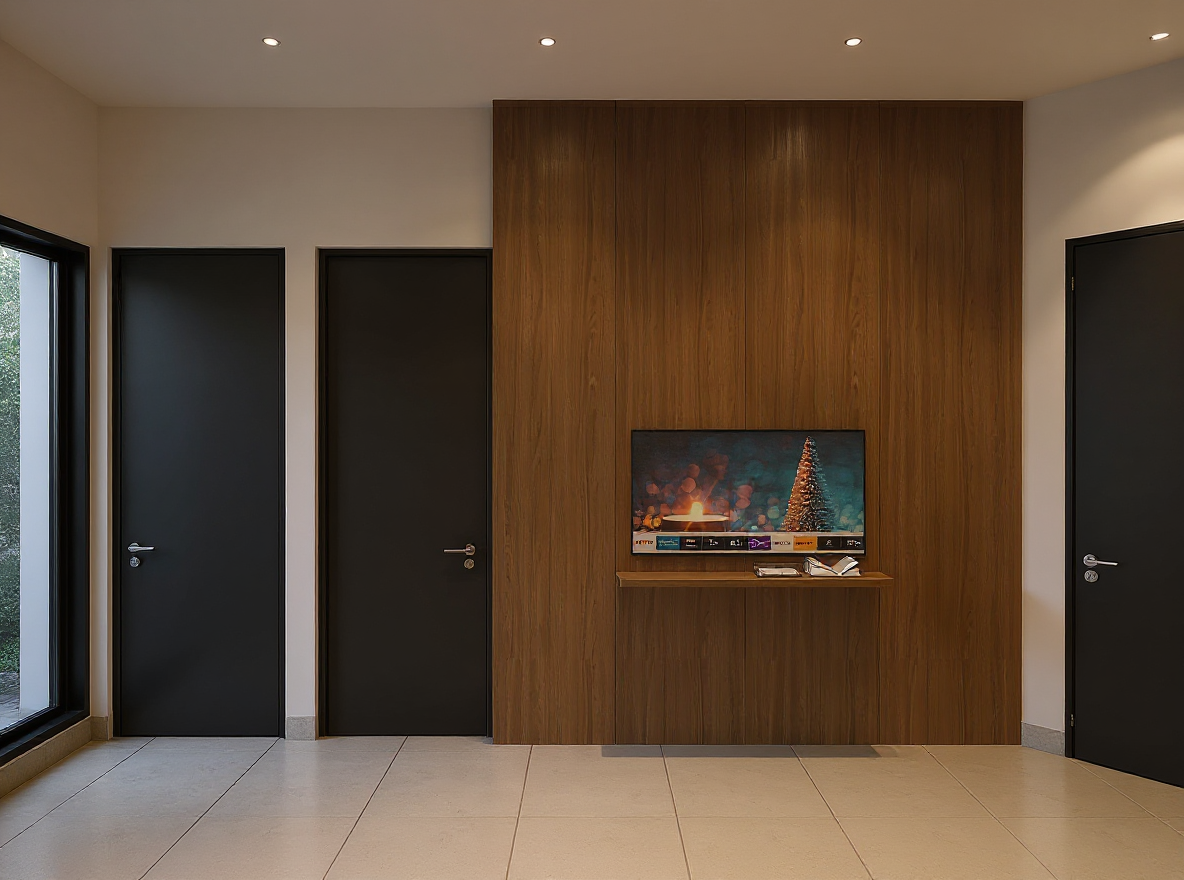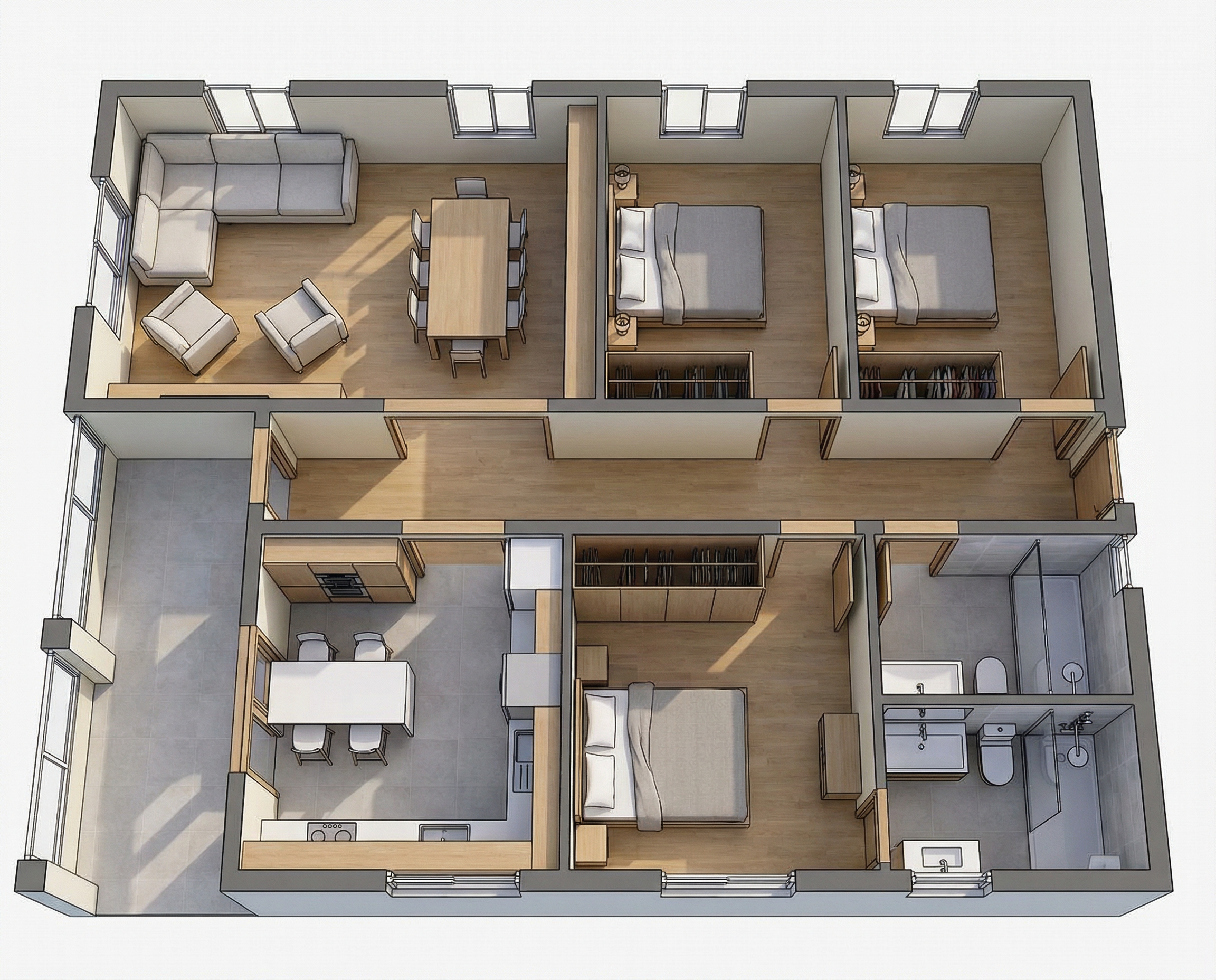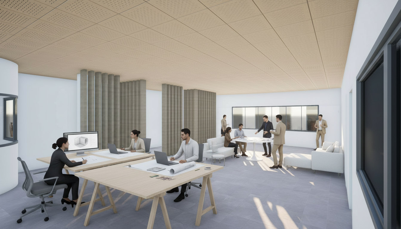 modern interior shot use the uploaded image as the base reference transform this space into a lived in contemporary office while strictly preserving the existing architecture proportions materials and lighting add a small group of people 5 8 maximum working naturally in the space architects and designers at desks people discussing around a table one or two people walking or standing relaxed natural postures candid moments no posing the people must feel realistic discreet and integrated with neutral elegant clothing beige white grey soft black tones no exaggerated gestures no smiles toward the camera no stock photo look maintain a calm high end architectural atmosphere soft natural daylight balanced exposure realistic shadows and reflections subtle depth of field the office should feel active but serene professional creative and credible the focus must remain on the architecture with people enhancing the sense of scale and life not dominating the scene ultra realistic photographic quality architectural visualization level no distortion no warped geometry no changes to the base image structure architecture