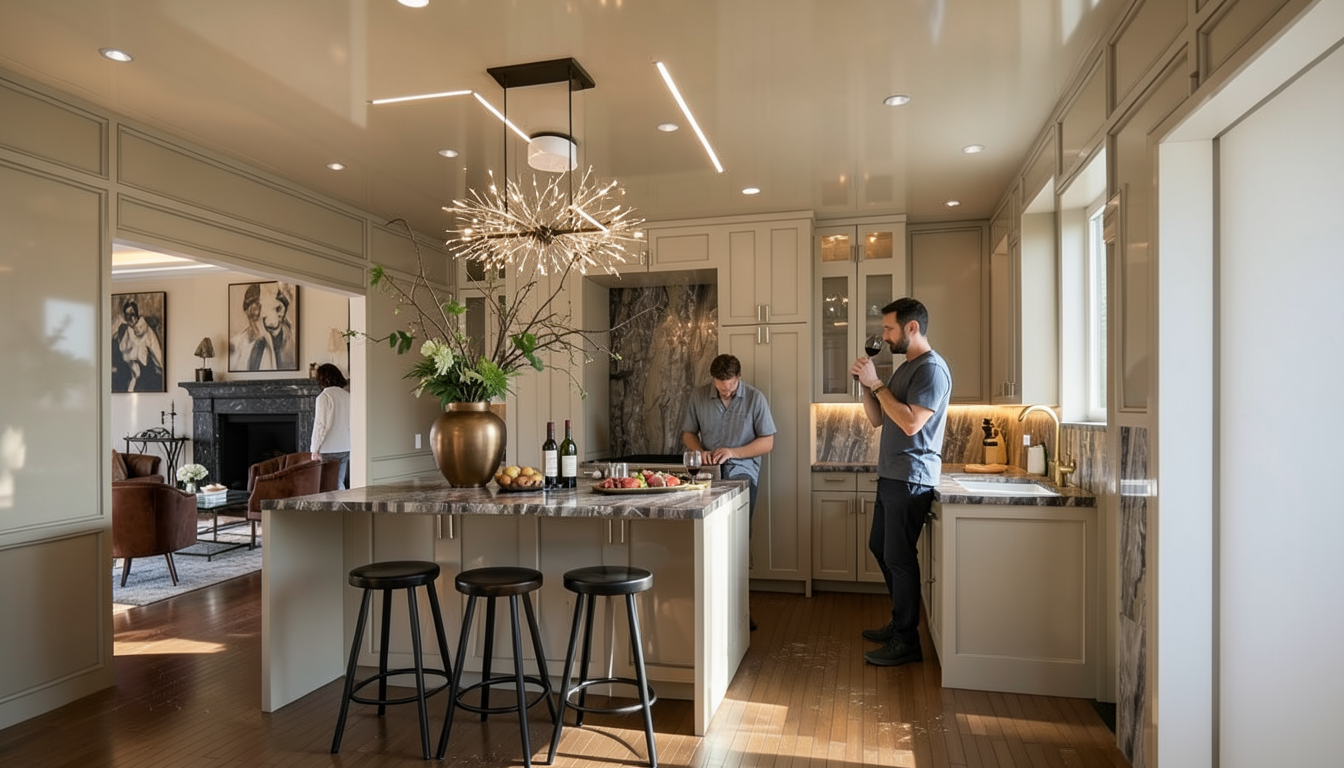 render this kitchen looking into the double height living room with dark blue shaker style cabinets the 3 upper cabinets above the stove to be walnut cabinet hardware to be brass bar pulls sink faucet to be brass appliances to be white with brass handles countertop to be white quartz with slight grey and gold vein backsplash to match flooring to be medium oak wall paint to be white window sills to be white