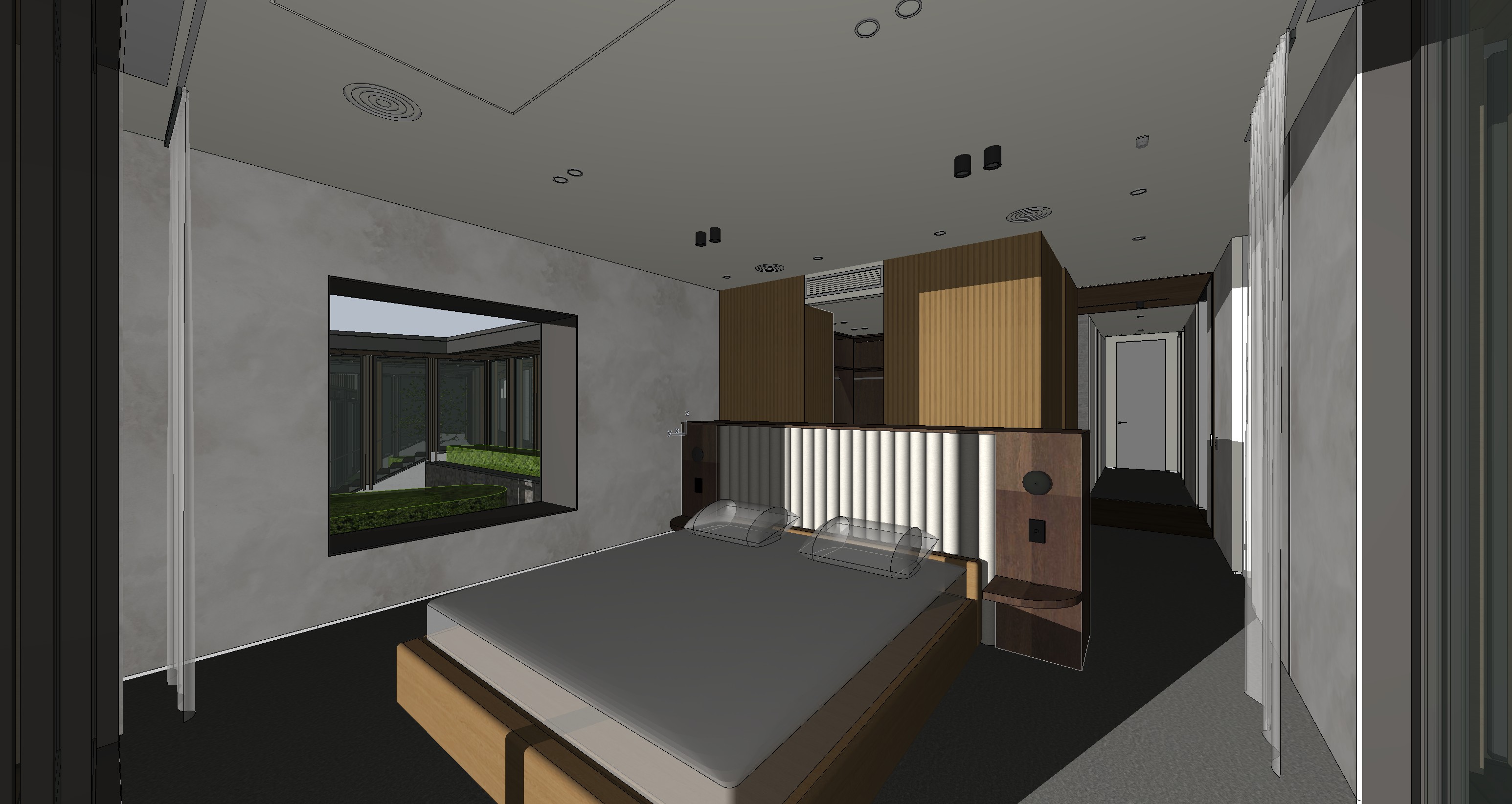 hyper realistic architectural interior photograph of a modern luxury master bedroom captured with a full frame dslr camera 24mm lens natural perspective the space features textured loop pile wool carpet in soft beige colour like bremworth transpire in emerge on floor bedhead joinery is a rich brown timber veneer with subtle wood grain curtains are sheer white bedding is a cream linen lighting warm 2700k ambient lighting with recessed ceiling downlights and subtle indirect lighting creating soft shadows and realistic falloff balanced mix of natural daylight and warm artificial lighting accurate global illumination soft reflections ambient occlusion and realistic material response highly detailed materials micro surface imperfections wood grain variations physically accurate reflections and refractions camera settings f 8 aperture iso 100 high dynamic range crisp focus across scene slight depth realism without blur true to life color grading cinematic but natural no overexposure style editorial architectural photography similar to high end interior design magazine e g architectural digest ultra realistic 8k resolution ray traced lighting photoreal textures