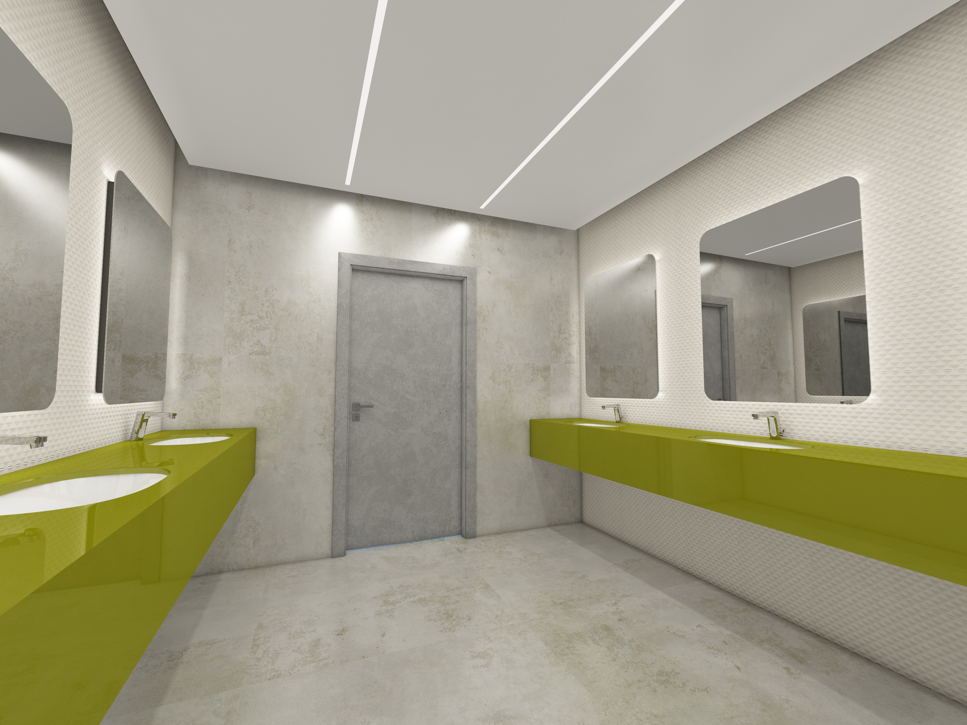 make a photorealistic view of the washroom turn on the linear lighting on the ceiling