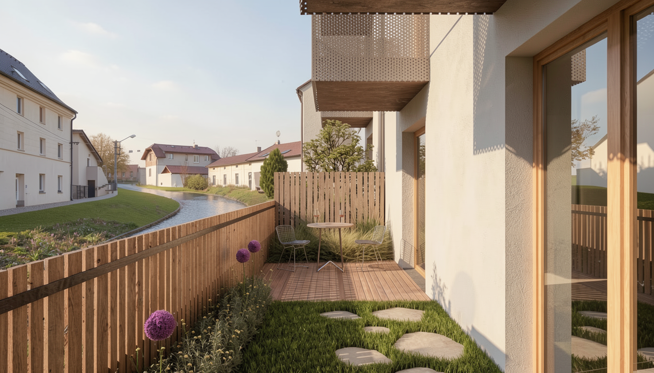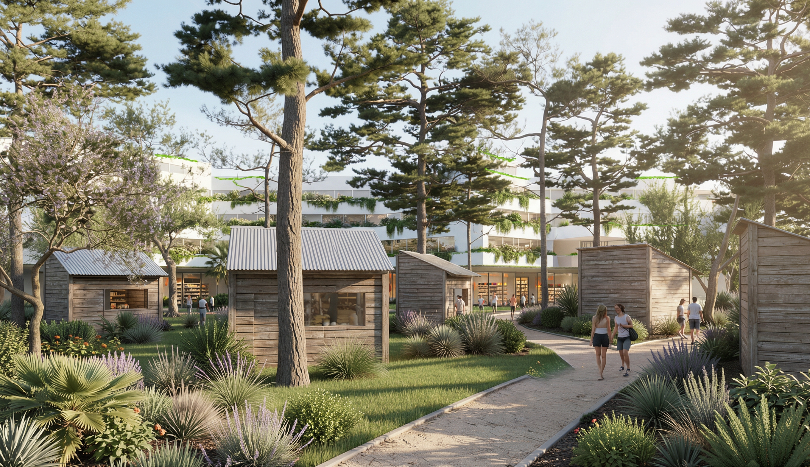 make the orange areas for commercial spaces transparent add vegetation on the balconies along the green lines keep the balconies opaque no cambies materiales mejora el camino