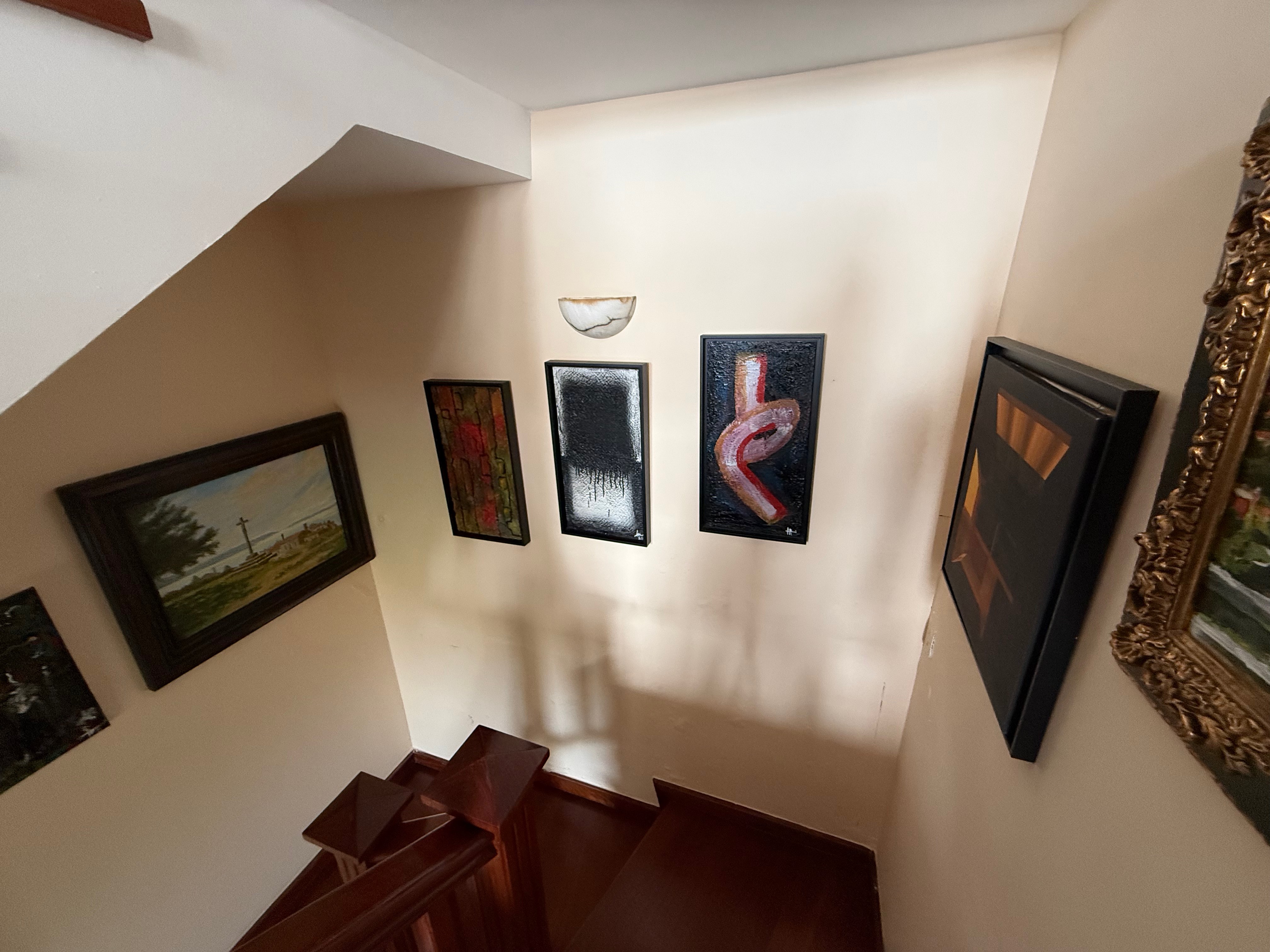 the scene shows an intermediate landing of a staircase where damp patches have appeared that i cannot stop i need to cover the vertical surfaces with a material made of faux stone cladding of irregular masonry up to the height of the wall mounted electrical light fixture