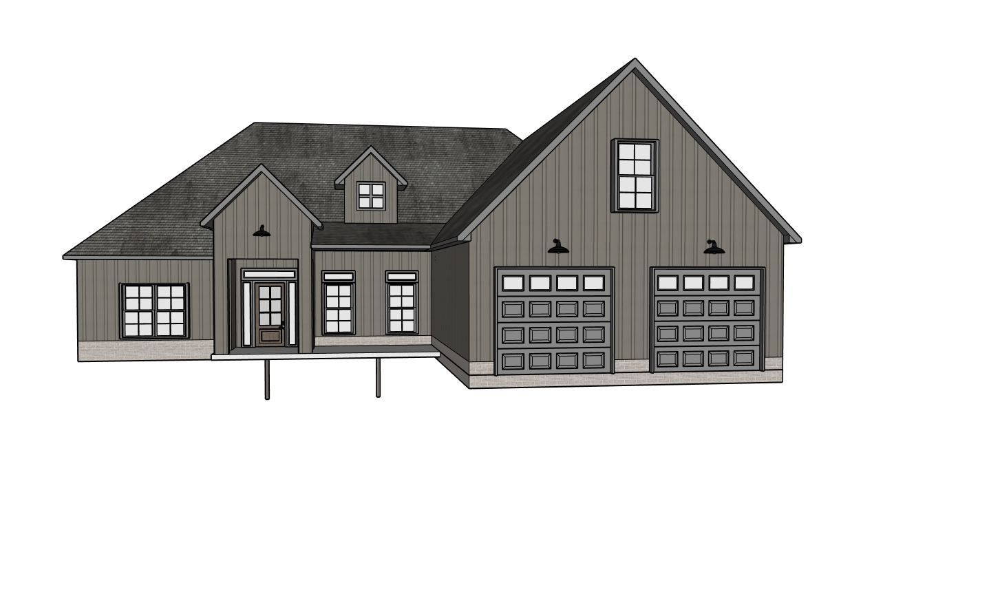create a beautiful rendering of a modern house featuring a gray wooden exterior with vertical siding the roof should be a darker charcoal gray made of shingles the garage doors windows and front door should be highlighted with charcoal trim set against a clear blue sky and surrounded by a lush green lawn with some flowering plants near the entrance emphasize a warm welcoming atmosphere with natural lighting that casts gentle shadows house is in a neighborhood