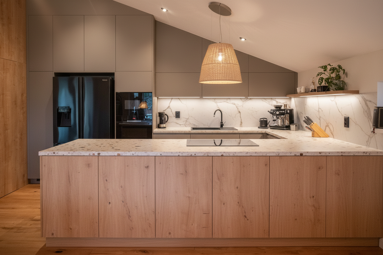 the vanity cabinet has two door and is made of american walnut wood venner showcasing natural wood grain elegant texture and a high end appearance with a white countertop the surfaces must appear fully seamless continuous clean and subtly reflective with no visible joints emphasizing a smooth monolithic look the walls and floor are finished in medium porcelain tile with a soft texture the ceiling is white the mirror features a perimeter frame in american walnut venner with indirect inlighting producing a soft warm ambient glow that enhances depth and highlights material textures the shower doors are made of tempered glass with stainless steel hardware add bathroom accessories and decoration for a realistic and elegant ambiance change the size of the porcelain tiles to a little more smalll medium beige porcelain tiles featuring a subtle textured surface for added depth and realism the toilet should be one piece design