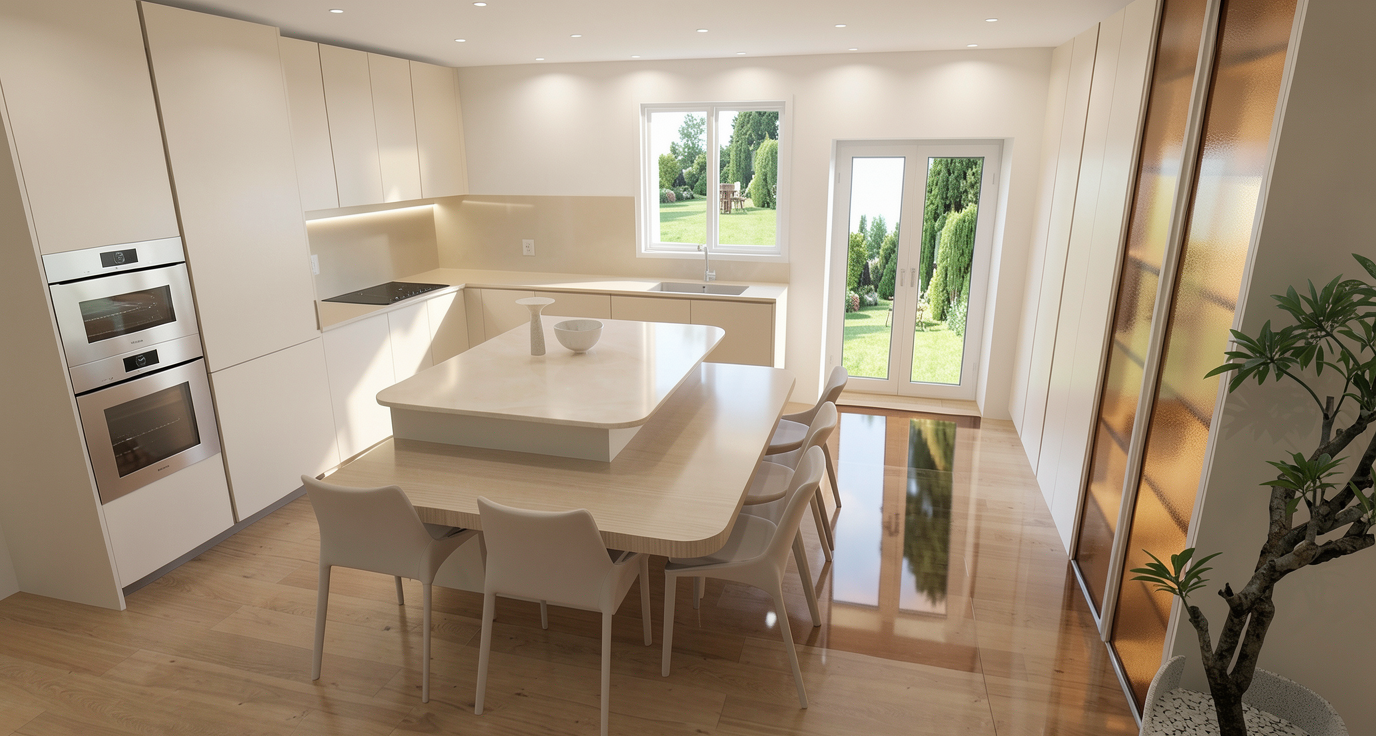 its a residential building in crete inside the village agia marina keep exactly the same geometry at the facades of the buildings is used stucco in earthy beige color and beige mosaic cladding the lower part of the fencing is beige stucco a bit darker that the one used in the building facade the upper part of the fencing is pvc panel in ral 7006 doors and windows in ral 7006 make more realistic materials and lighting add garden vegetation the balconies have led strips for lighting
