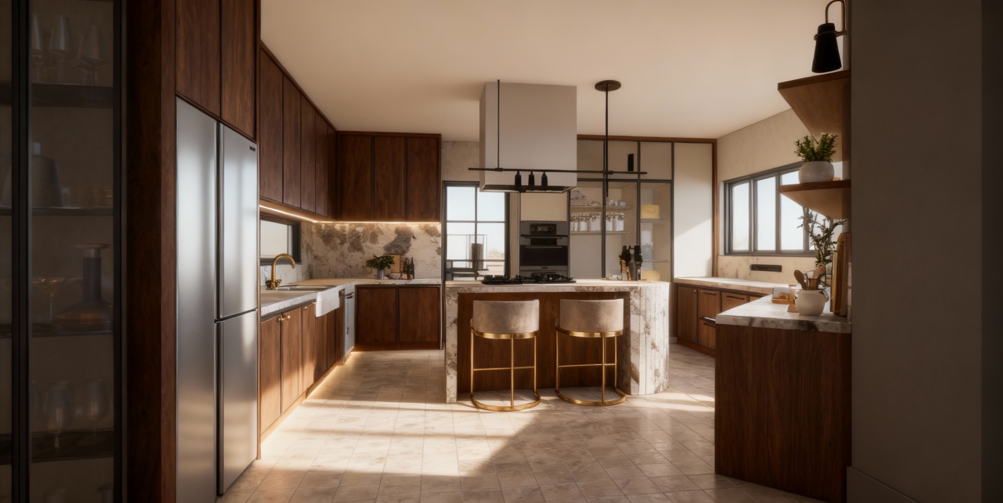 create a beautifully rendered modern dining and kitchen area use a soft warm color palette with dark walnut flooring the walls should be a sophisticated light grey and the cabinetry is a natural wood tone with subtle grain incorporate black metal accents in the furniture and fixtures for a chic contrast add a lush green plant on the open shelving for a touch of nature feature a marbled texture for the wall behind the tv adding elegance ensure the atmosphere feels inviting and cozy with soft lighting to enhance the warm homely ambiance