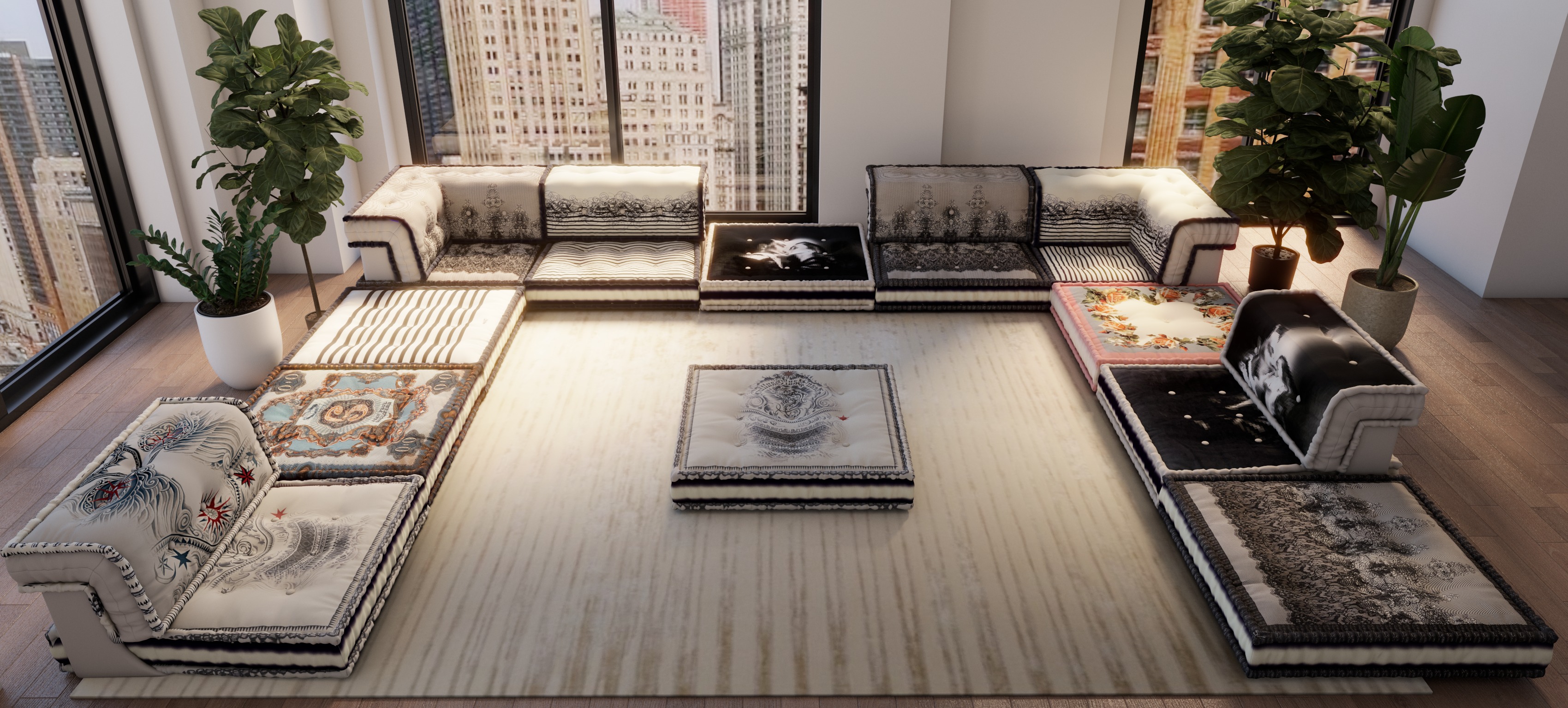 render a modern luxurious living room with a modular sofa arrangement featuring intricate black and white patterns and elegant designs include vibrant floral patterns with touches of red and green accent the sofa with different colored cushions including soft blues and faded browns use light wood flooring adorned with a plush cream rug at the center through the large windows depict a cityscape with high rise buildings in soft tones add lush green potted plants by the windows for a fresh inviting atmosphere emphasize a warm cozy ambiance with natural light streaming in highlighting the textures and colors