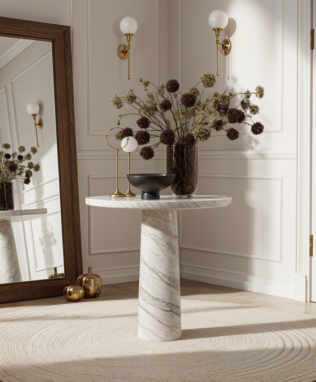 render this entry table for autumn the entry should be large and bright in a transitional style the objects on the table are magnifying glasses a black bowl and a brown glass vase
