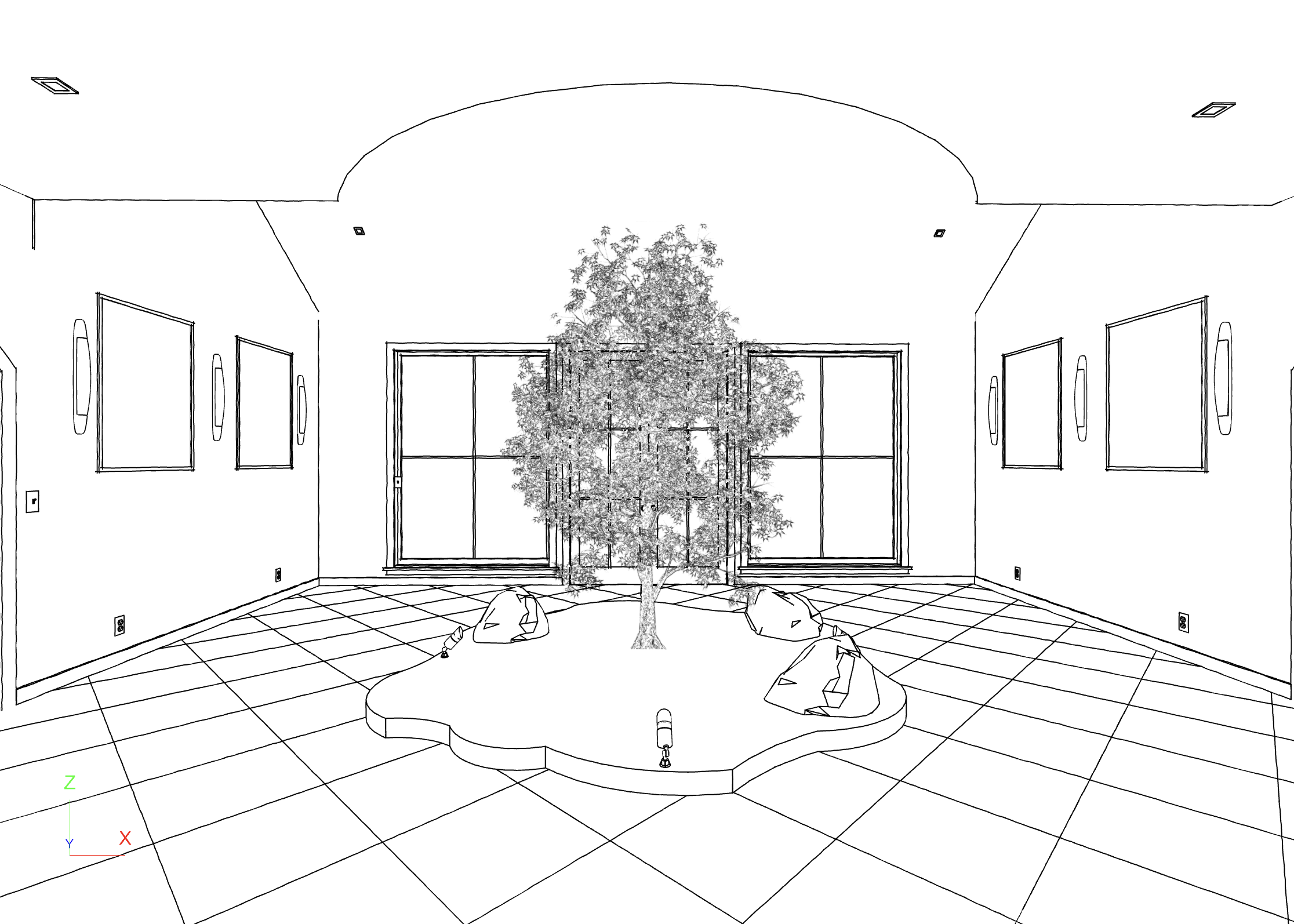 render a serene elegant room with a central tree and rounded windows use soft cream walls and a warm beige ceiling the floor is a polished light tan tile giving a smooth texture the central tree is lush with vibrant green leaves surround the base with natural stones in soft gray the arched windows feature rich dark brown wooden frames picture frames on the walls are mahogany accented by minimalist wall sconces casting warm white light the overall atmosphere is calm and inviting with subtle natural light filtering through the windows