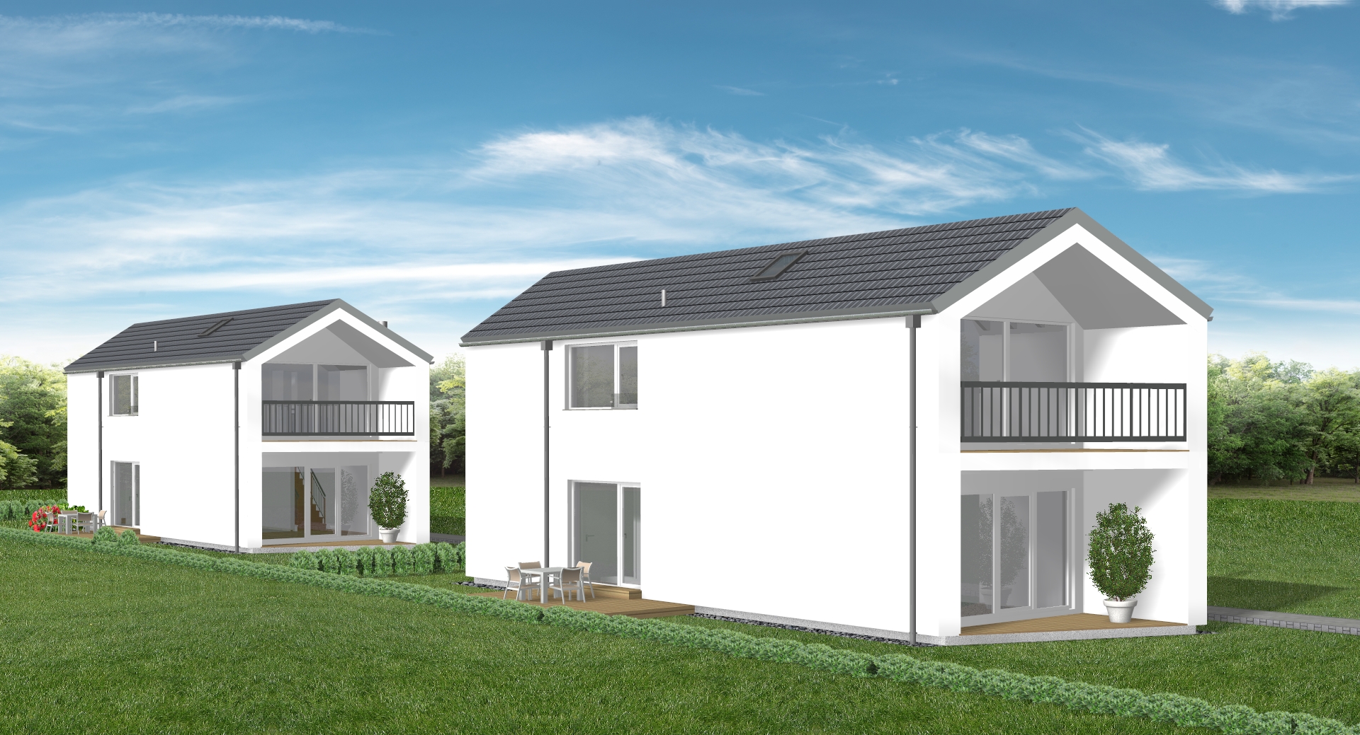 erstelle eine realistische ansicht beider h user mit l rchenholzfassade