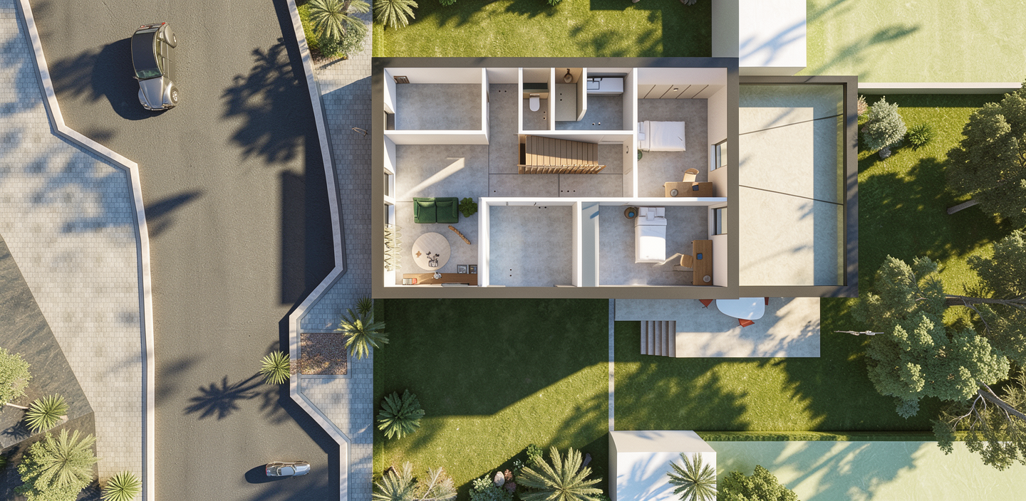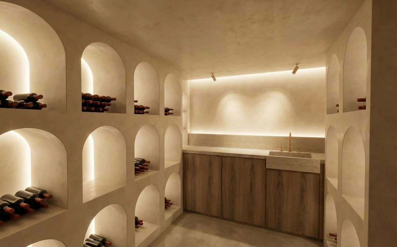 soften the light flow from the wall mounted spotlights to reduce the intensity on the walls add two wine glasses and a wine bottle on the countertop maintain the same minimalist style axonometric view and material details emphasizing the subtle lighting on the surfaces and objects