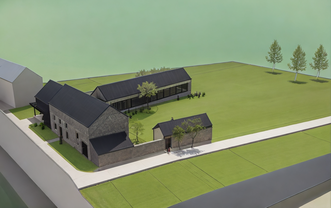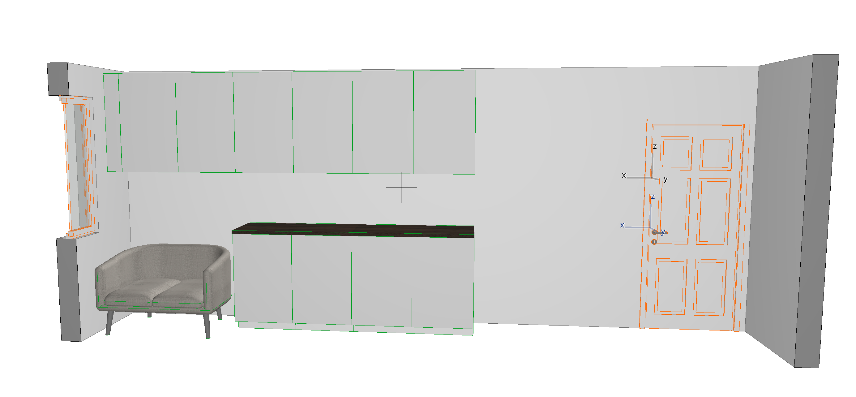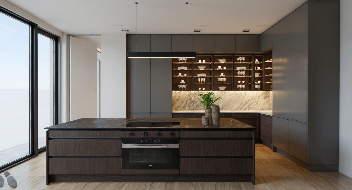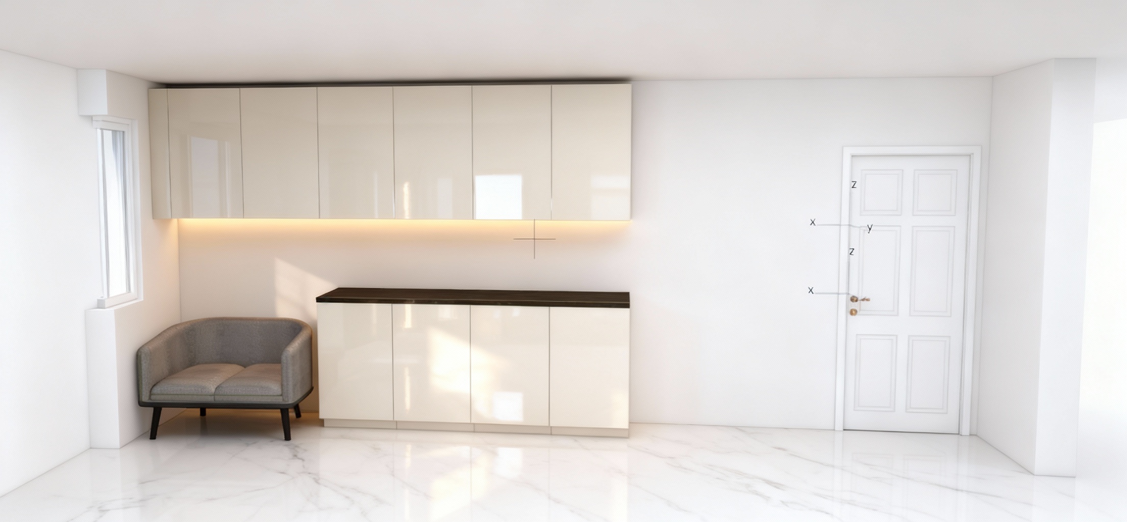 render a modern kitchen with high gloss handleless cabinets in soft ivory tone the kitchen door on the right hand side should be white overall look should be sleek glossy modern with warm lighting highlighting reflections flooring should be white marble window profiles white in colour do not add appliances wall in white colour the counter should be in light colours add some decorative objects on the counter do not add appliances the sofa should be in light beige tones