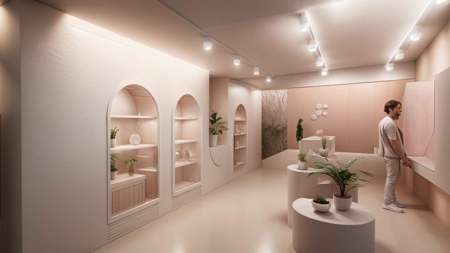 contemporary interior shot keeping the reception in it s original spot please clad the table with a black ceramic tile and clad the wall beside it with the same black ceramic tile add the logo of the ordinary on the front side of the table keep the skylights in the same place add recessed shelves on the left wall with small serum bottles architecture