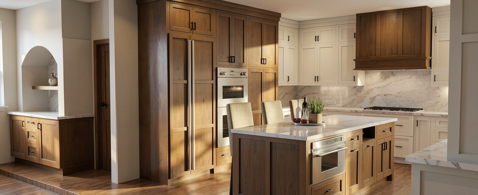 change the cabinet into a american walnut veneer with the countertop and backsplash in white corian the surface must appear seamless clean and subtly reflective wall cabinets in medium dark gray matte lacquer finished should be smooth non reflective include indirect lighting under cabinet led strips the lighting should create a soft ambient glow add in both sides of the wall cabinet a floating wood shelf into walnut veneer with under indirect led strips all the appliances must be represented in stainless steel with realistic reflections and finishes the cooktop is a 4 burner electric ceramic cooktop the lightning should be warm and balances the floor change into a laminate dark walnut veneer flooring and white plaster finish on walls and ceiling change the yellow material into american walnut veneer add the kitchen decorating like spice containers whit glass jars with wooden lids replacing a high arc stainless steel single handle kitchen faucet change the red material of the shelves into a american