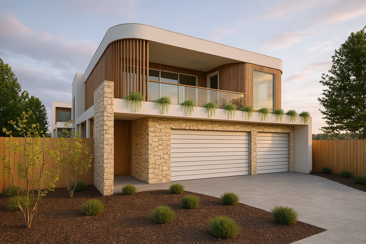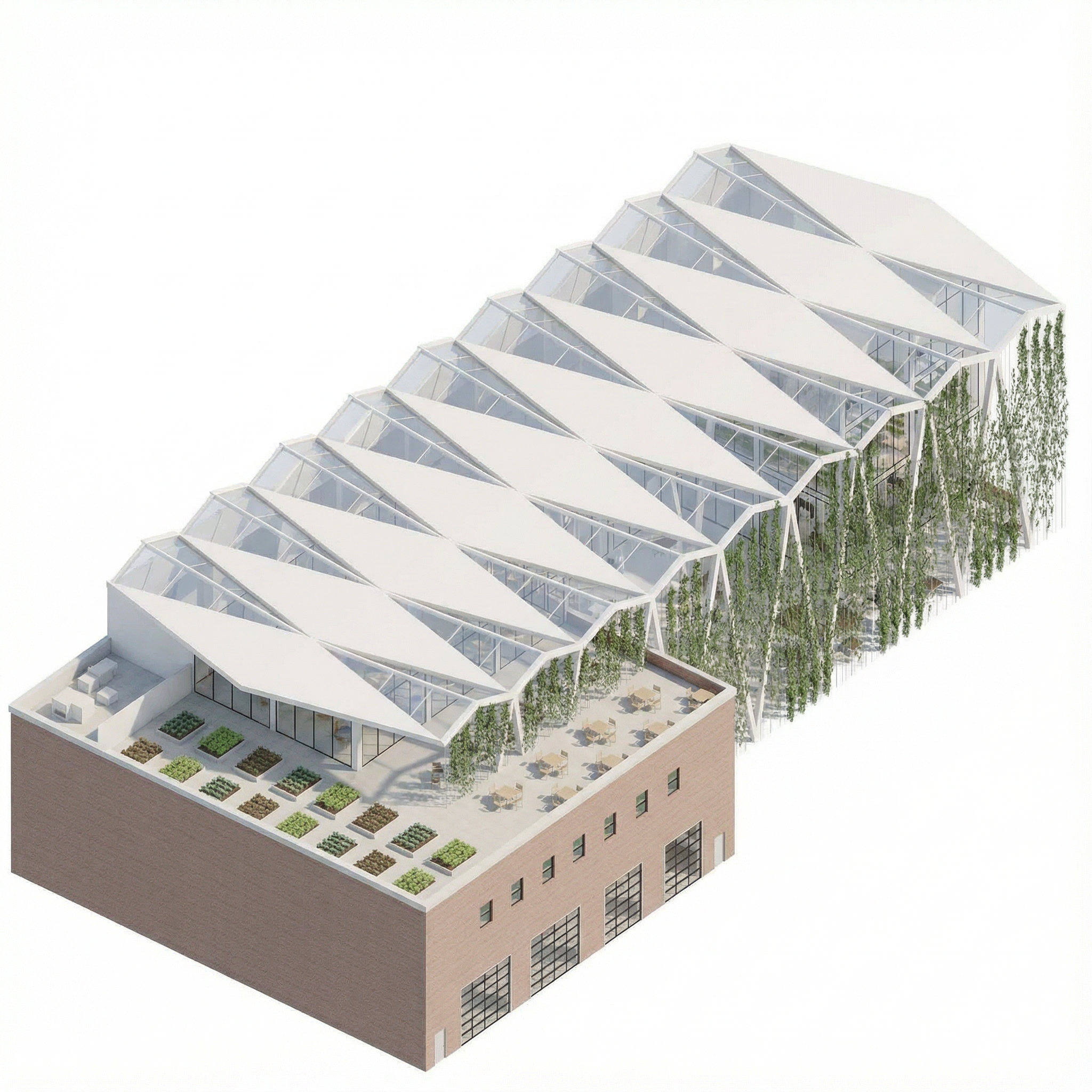 render the building in this image with soft texture the roof is a grey metal panel roof the walls are textured white render the image so it architectural dimension overlay make it look like a technical sketch please no measurment tags anywhere the opening should be a steel panel garage door