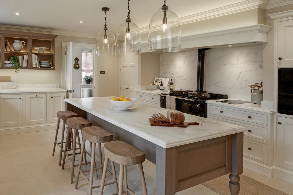 interior shot shaker style kitchen interior with dinning table vaulted oak frame interior ceiling aga oven