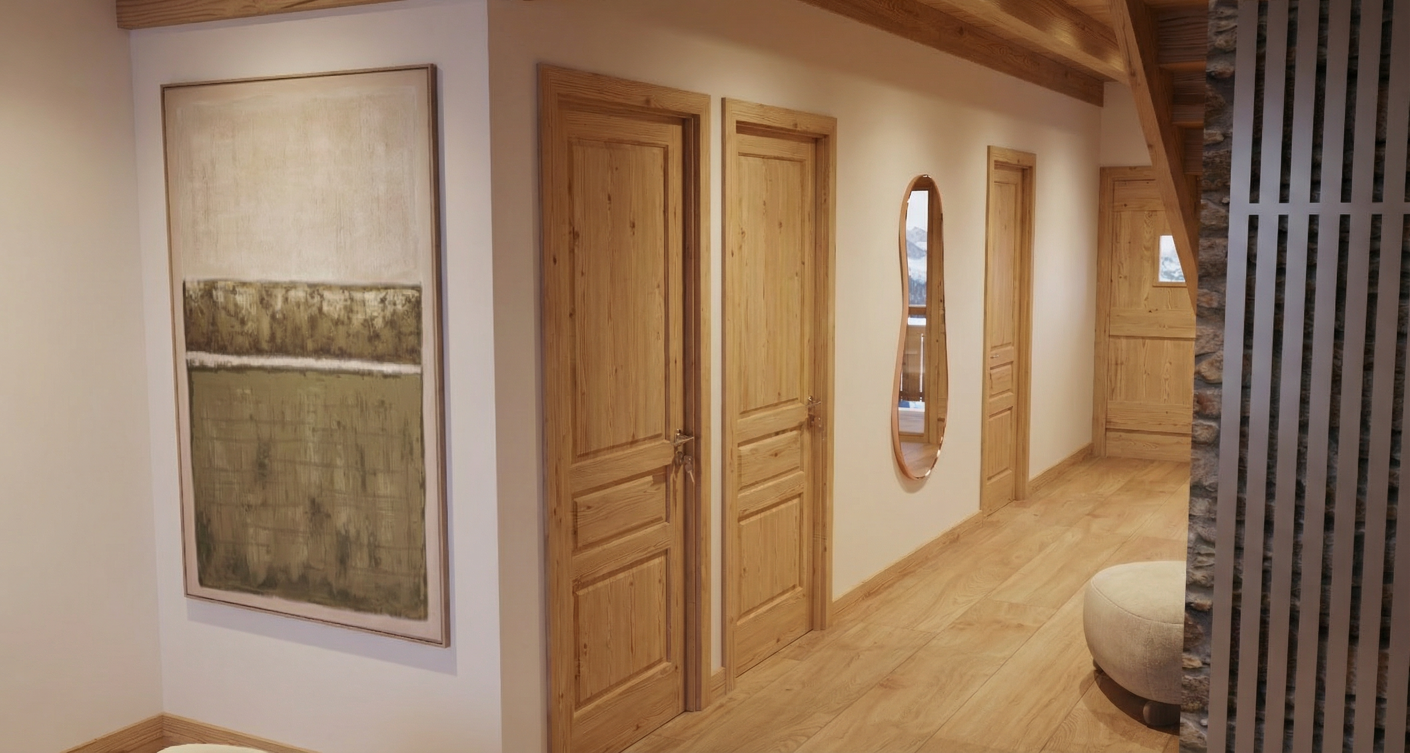 photorealistic outdoor of a new beige building with grass and modern plants tress and houses on the background warm tones add a concrete path on the grass