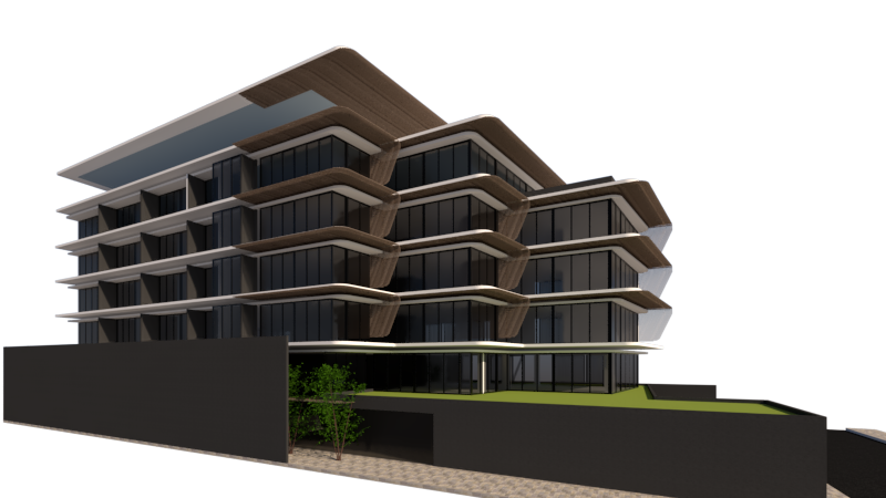 render a modernist architectural building with sleek angular lines use a palette of light gray for the concrete deep charcoal for the window frames and reflective glass the building should stand in an urban landscape with a clear blue sky and warm sunlight to create a bright and inviting atmosphere add subtle shadows for depth and dimension highlighting the building s geometric design on the black metalic pots on each balcony some green plants hanging